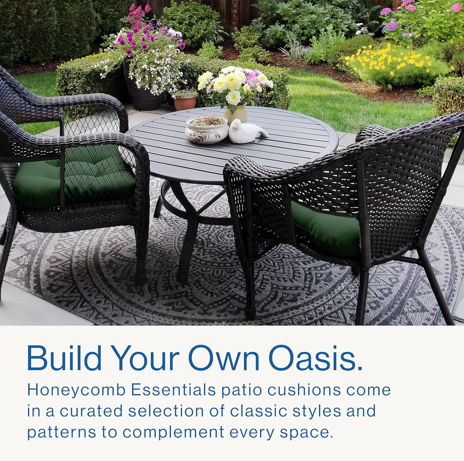 • Classic Design - Elevate your outdoor furniture in quality and style at a price that fits your budget. Honeycomb Essential cushions are a curated selection of our classic styles paired with fresh patterns designed to complement any space.