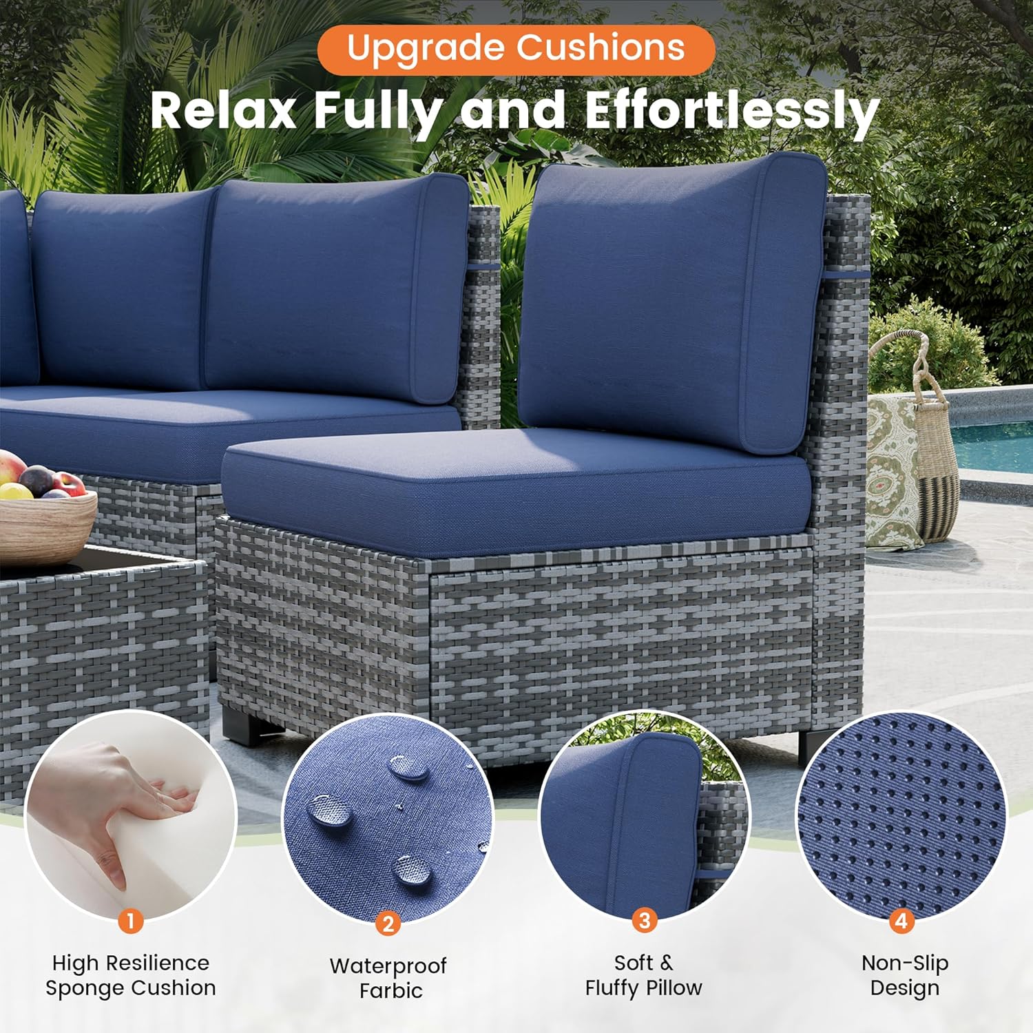 UDPATIO Patio Furniture Set with Fire Pit Table, 8 Inch Armrest Outdoor Sectional Sofa, Wicker Outdoor Furniture Conversation Sets with Waterproof Cover for Backyard Deck(Grey/Navy Blue)