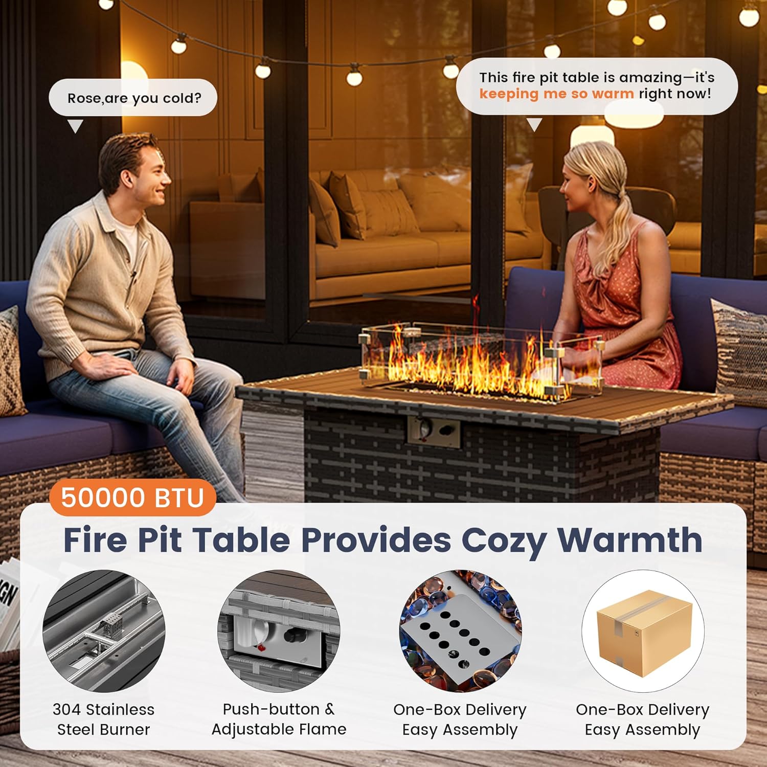 UDPATIO Patio Furniture Set with Fire Pit Table, 8 Inch Armrest Outdoor Sectional Sofa, 9 Piece Wicker Outdoor Furniture Conversation Sets with Waterproof Cover for Backyard Deck(Grey/Navy Blue)