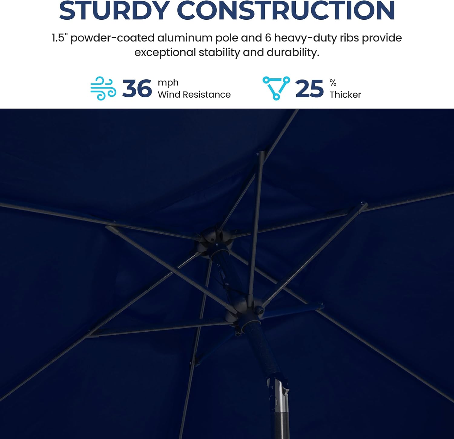 - STURDY FRAME: Beach umbrella sturdy 1.5" metal rods are powder-coated metal to prevent rusting or bending. Parasol thickened iron bones and six heavy-duty steel ribs provide additional support for durability and stability