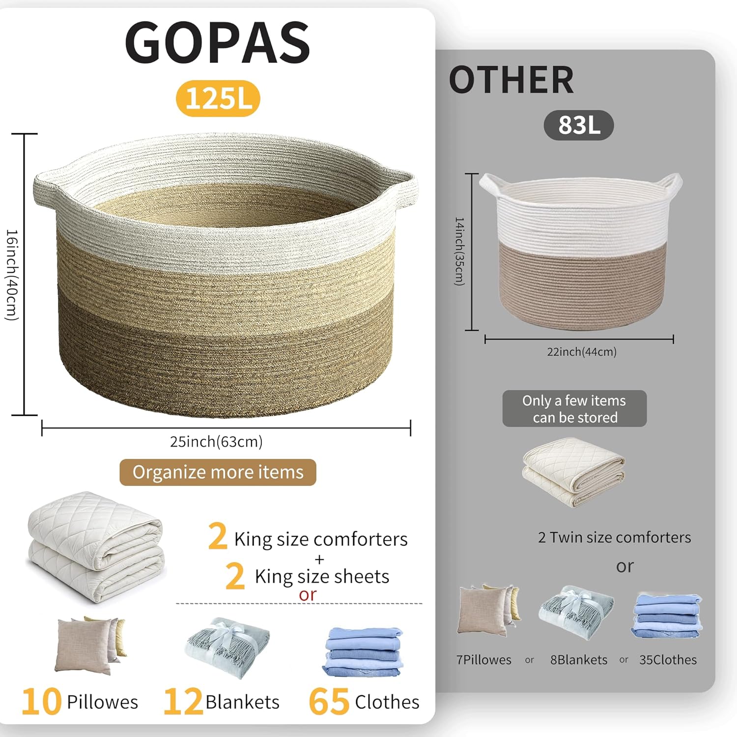 125L Extra Large Blanket Basket, 25" x 16", Jumbo Laundry Woven Basket Decorative Home, Cotton Rope Basket with Handles, Baby Toy Basket for Storage, Gradual Brown