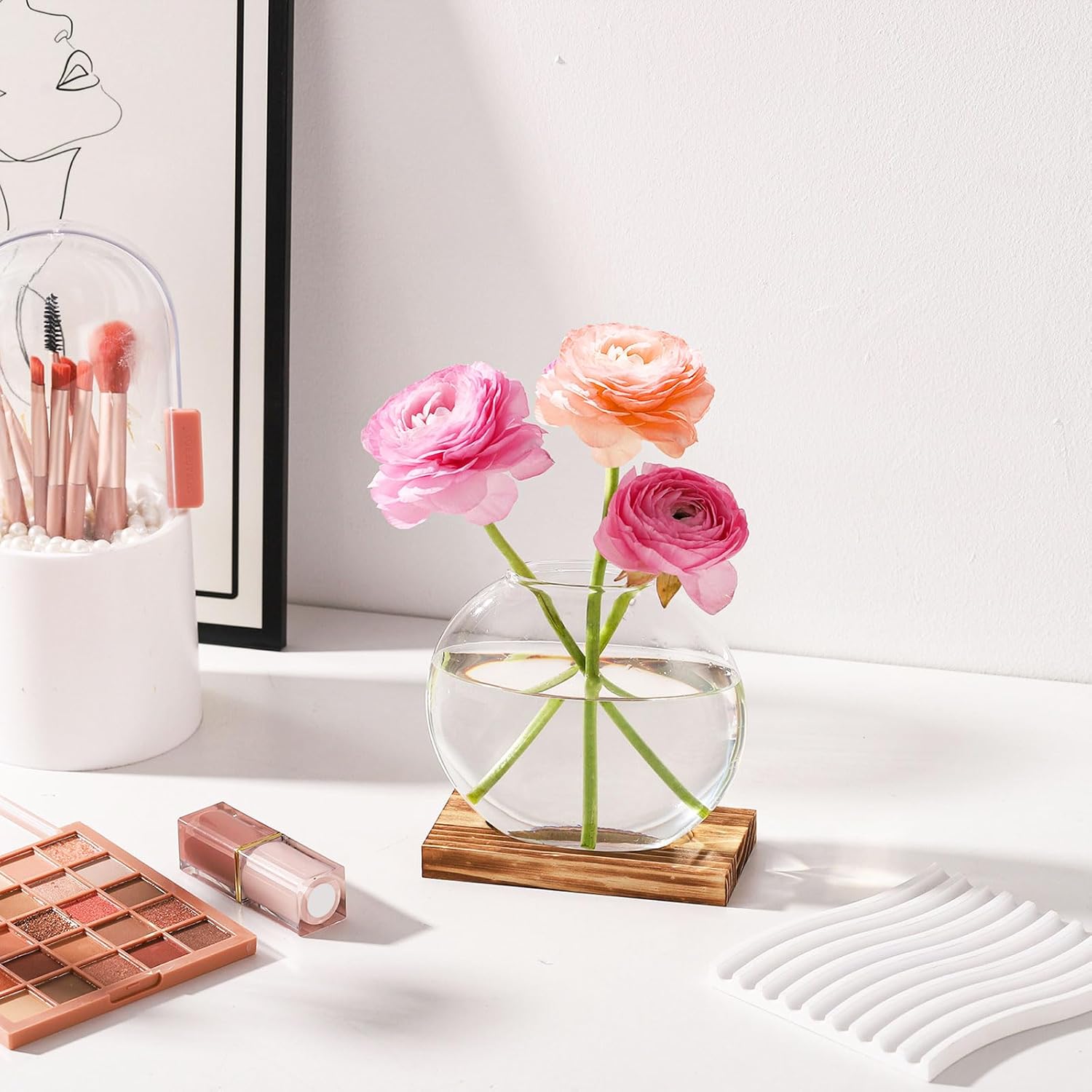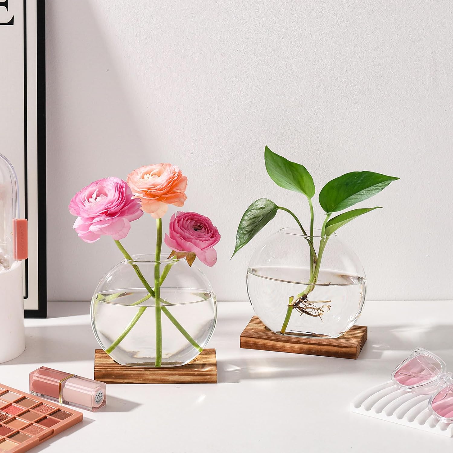 2 Pack Plant Propagation Station with Wooden Base Glass Terrariums for Indoor Plants Decorative Round Vases for Flowers Hydroponic Planter for Home Office Decor
