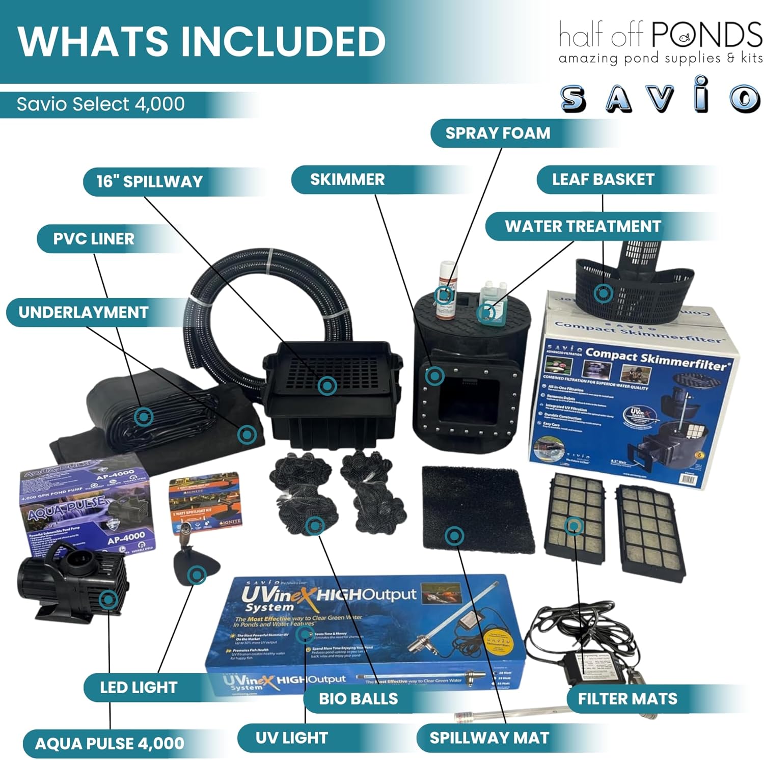 HALF OFF PONDS Savio Select 4,000 GPH Submersible Pump Pond Kit with 15' x 15' PVC Plastic Pond Liner, UV Clarifier for Water Garden & Koi Pond