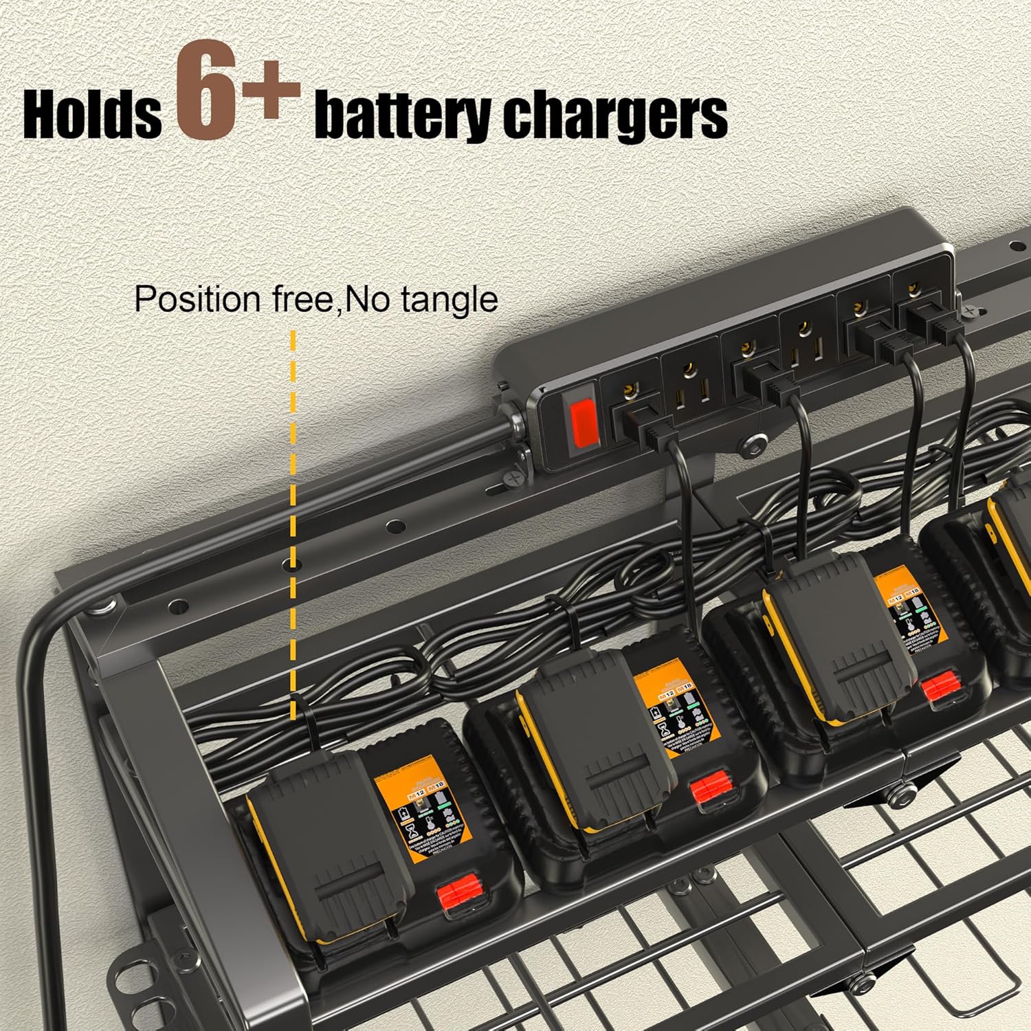 - Built-in 6-Outlet Power Strip: The Spampur Power Tool Organizer with Charging Station charges up to 6 power tools simultaneously. Features an angled panel for easy-access plugging. UL-certified for worry-free safety.Mounted 3.2" above mesh shelf for space efficiency.
