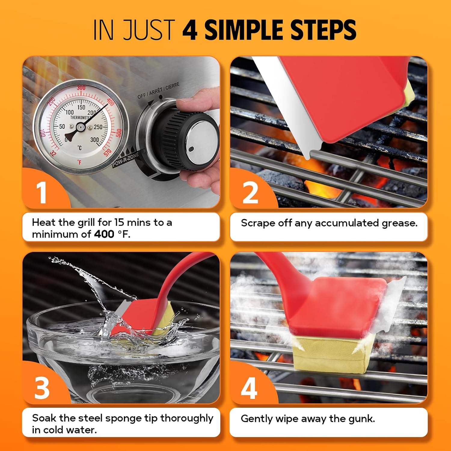 - HOW TO WORKS? 1) Heat the grill for 15 mins to a minimum of 400 'F. 2) Scrape off any accumulated grease. 3) Soak the steel sponge tip thoroughly in cold water. 4) Gently wipe away the gunk. You'll get a brand new grill and no more worries about eating the wire. A good helper for mom and dad