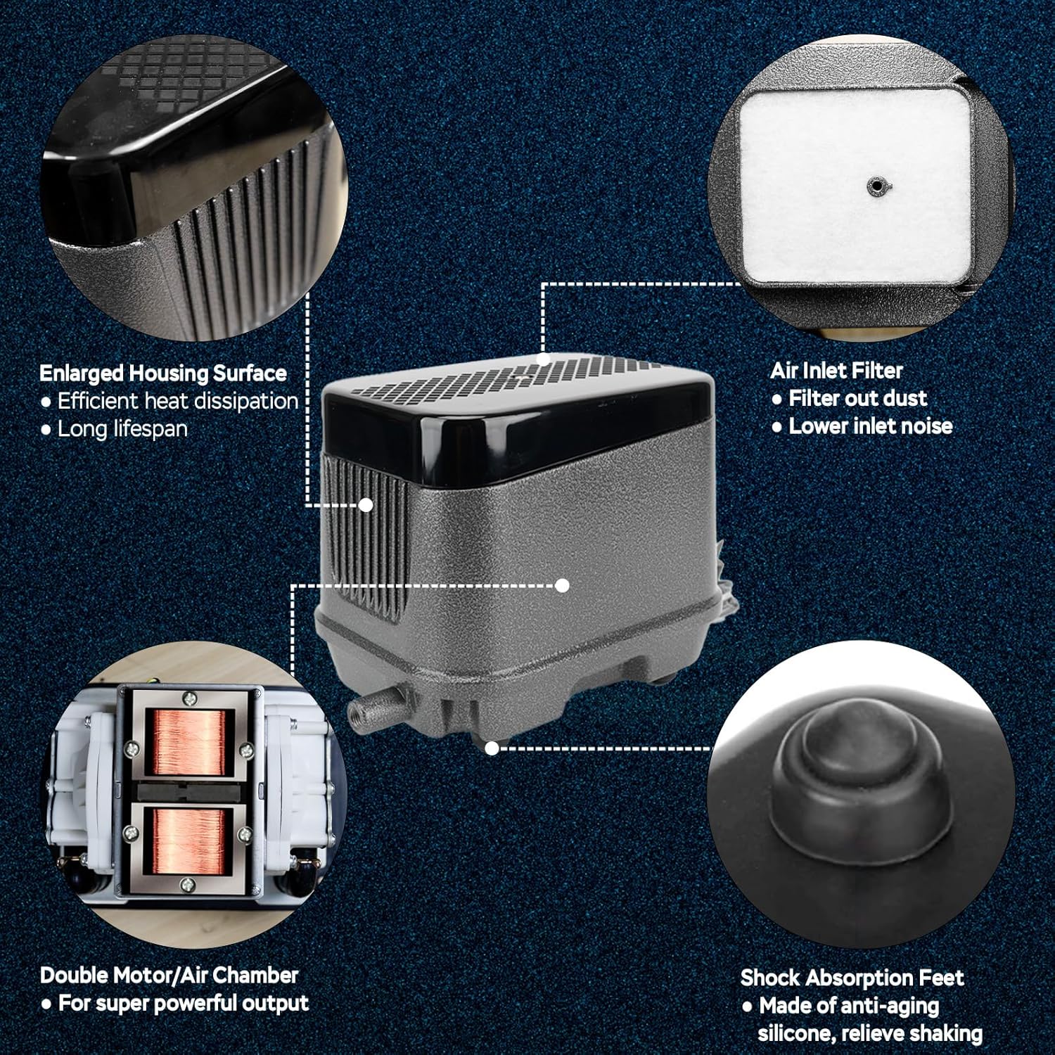 - GREAT HEAT DISSIPATION - The enlarged housing and optimized design of this septic air pump ensure superior heat dissipation, preventing overheating even during 24/7 operation. Keeps internal components at lower temperatures to extend pump life.