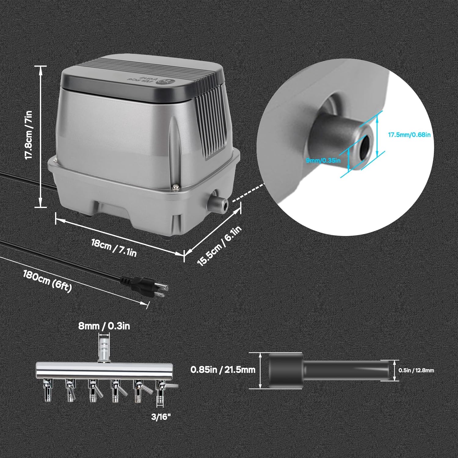 - PACKAGE - The pond air pump comes with a heavy-duty chrome-coated air diffuser (6 outlets with air volume regulators) to connect to air stones. Note: Airline tubing and air stones should be purchased separately.