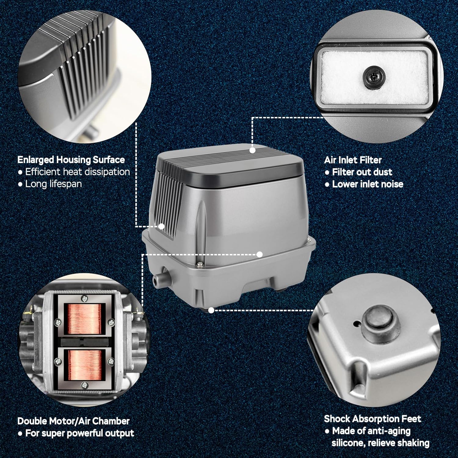 - SPECIFICATION - This linear air pump delivers a max of 635GPH powerful airflow at 0.03MPa pressure with an 18W energy-efficient copper coil motor that runs in stable operation and lasts longer. Perfect as a pond aerator, septic aerator, hydroponic air pump, or aquarium air pump, it provides high efficiency, low heat and low power consumption.