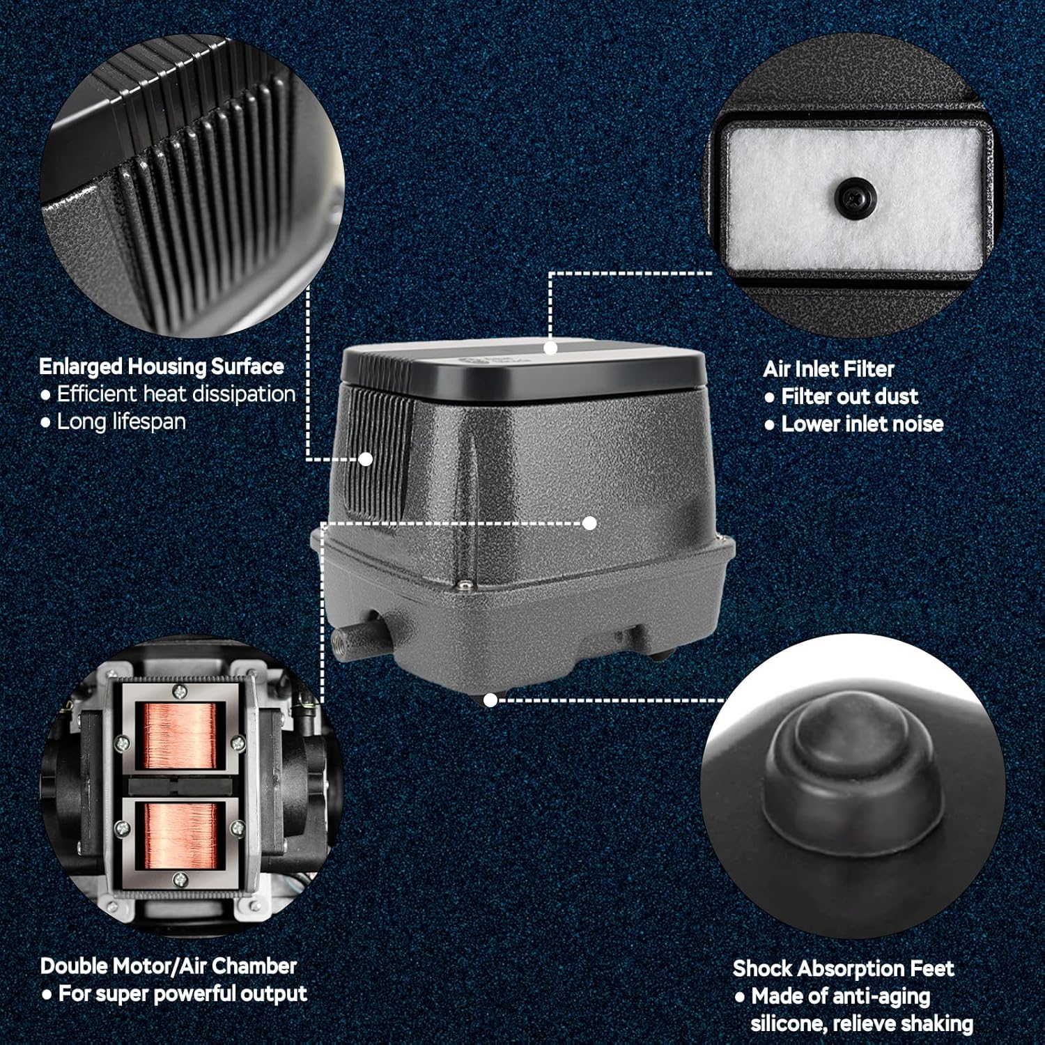 - GREAT HEAT DISSIPATION - The enlarged housing and optimized design of this septic air pump ensure superior heat dissipation, preventing overheating even during 24/7 operation. Keeps internal components at lower temperatures to extend pump life.