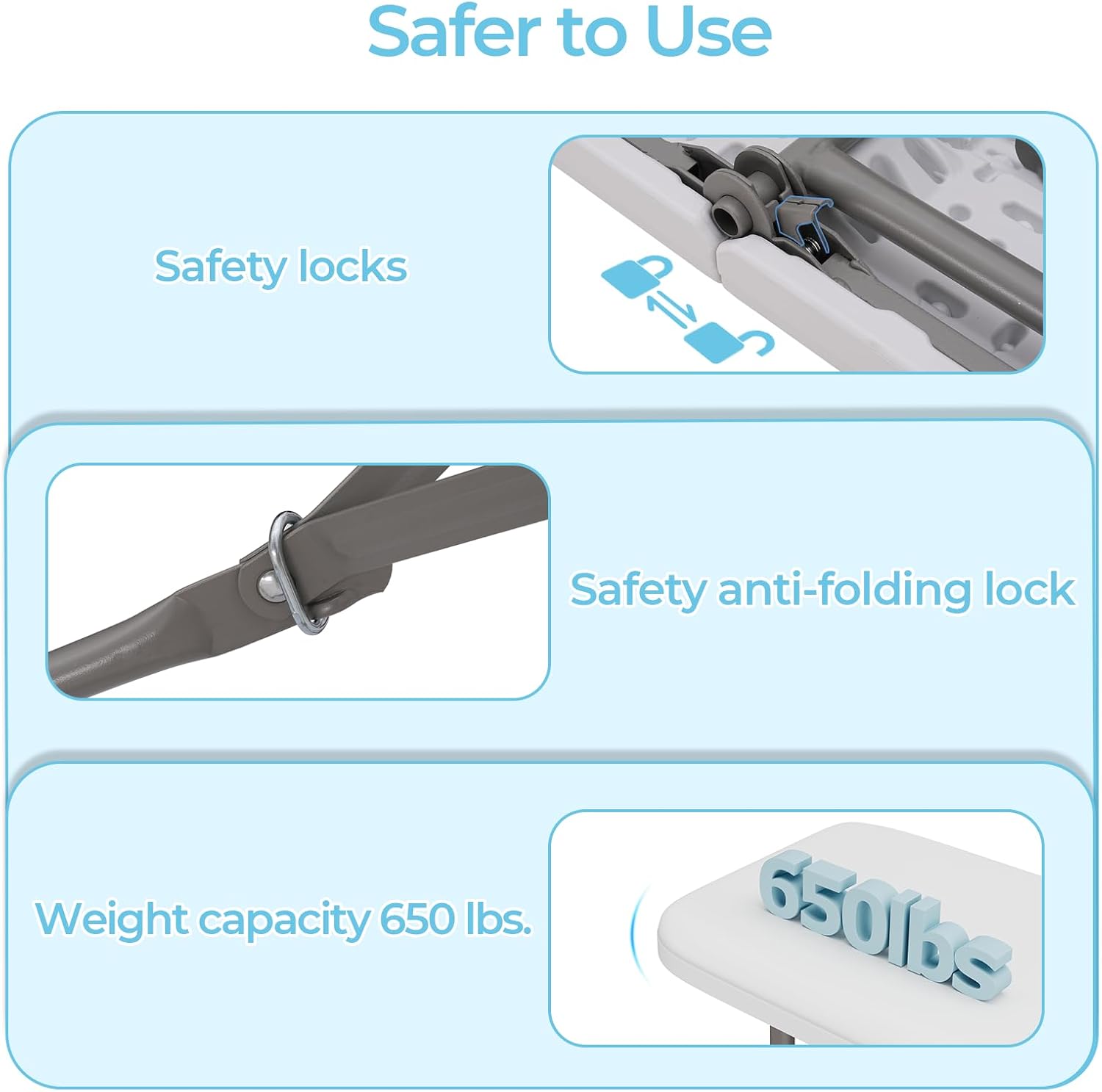 • Security Lock:Equipped with a metal safety lock at the folding of the seating plate, the safety lock will automatically lock when the bench is opened and remain in the open state. The legs of the foldable bench are designed with fixed locks to prevent folding when opened to ensure safe use.