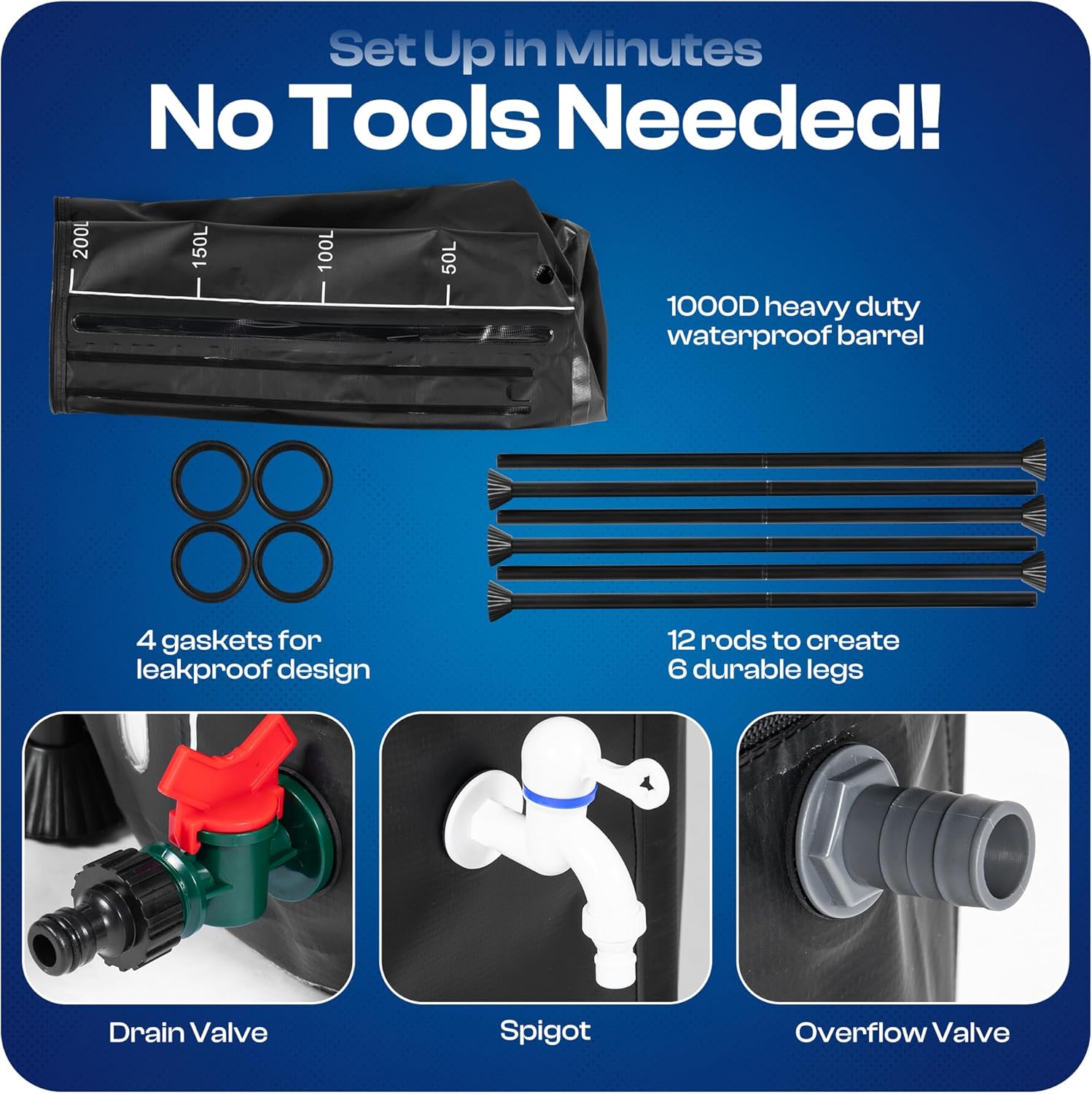 - 【EFFORTLESS INSTALLATION】Our portable water tank is easy to set up within minutes with no tool needed. Simply follow the instructions manual for a quick and hassle-free installation. Package Includes 12 rods for 6 durable legs, overflow valve, spigot, drain valve, 4 gaskets for leakproof design. If you have any problem with the product, feel free to reach out to us. Great for both beginners and experienced gardeners.