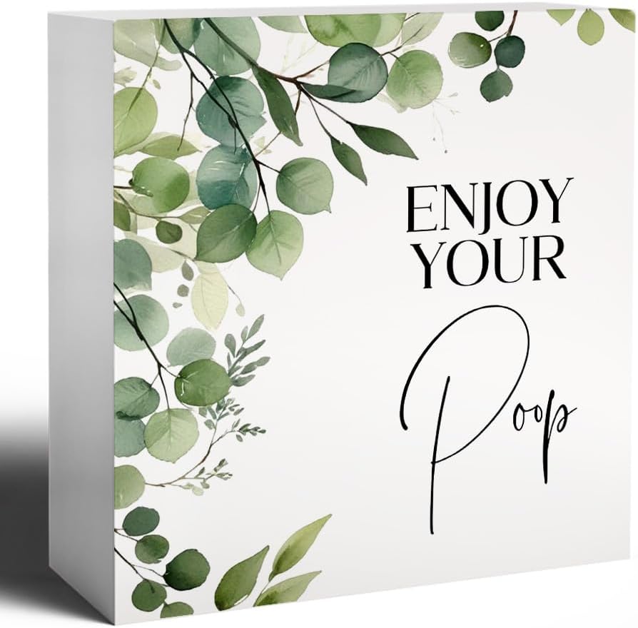 Funny Bathroom Signs, Enjoy Your Poop Humorous Wooden Box Sign, Eucalyptus Botanical Wood Signs Plaque for Bathroom Washroom Toilet Counter Shelf Table Decor, 5x5 Inch