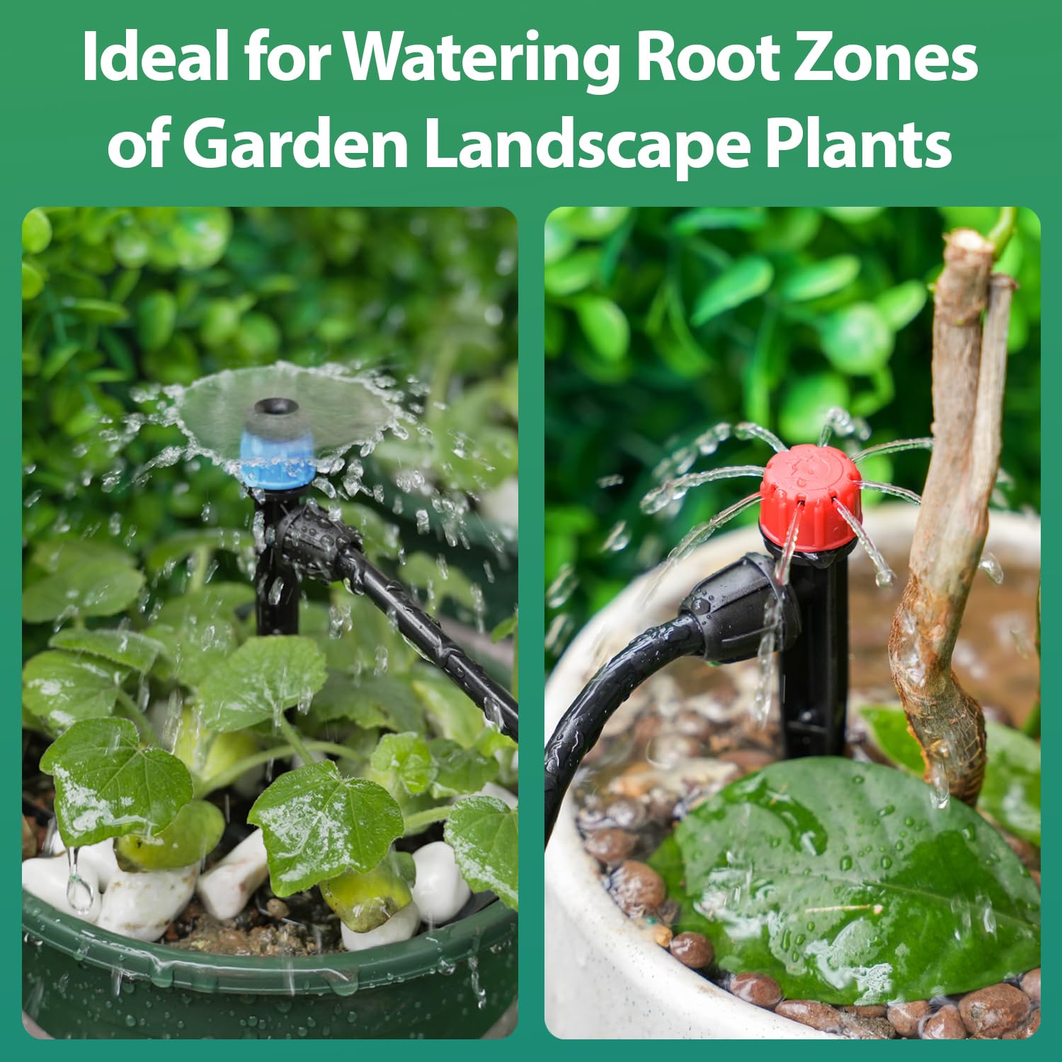 - 【Fully Adjustable for Versatile Watering】With our adjustable drip irrigation micro sprayers, you can easily manage your garden’s watering needs. Simply rotate the cap to control the water flow rate and adjust the sprinkling distance, giving you flexibility in how you irrigate. You can even fully close the irrigation emitters by rotating it, making maintenance a breeze. Their simple installation process means you can position these 1/4 inch emitter dripper precisely where they’re needed, ensuring all your plants receive the water they deserve