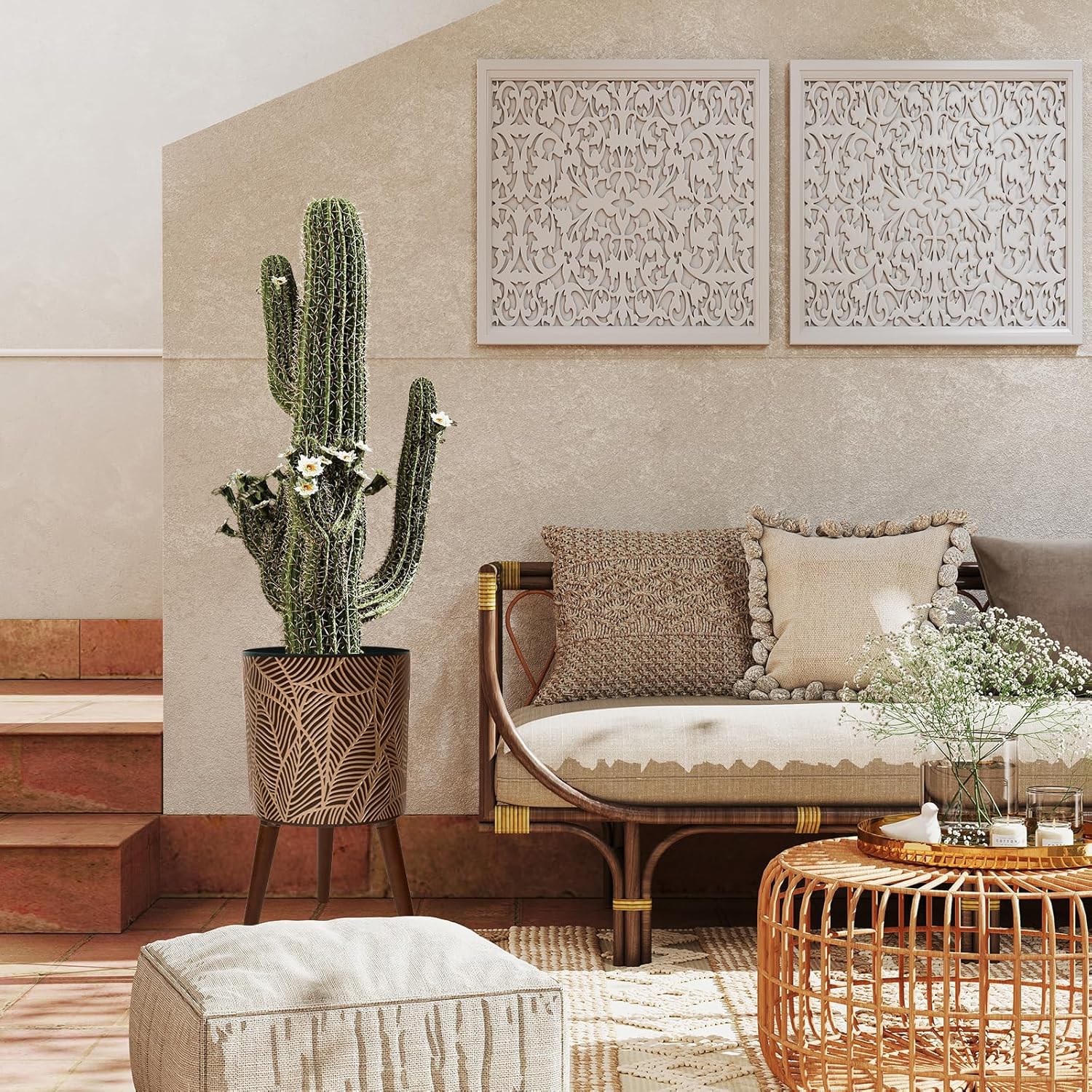 - Elegant Boho Design:Crafted with a sleek black finish and intricate gold floral embossing, this planter offers a refined boho-modern aesthetic that enhances any interior décor.