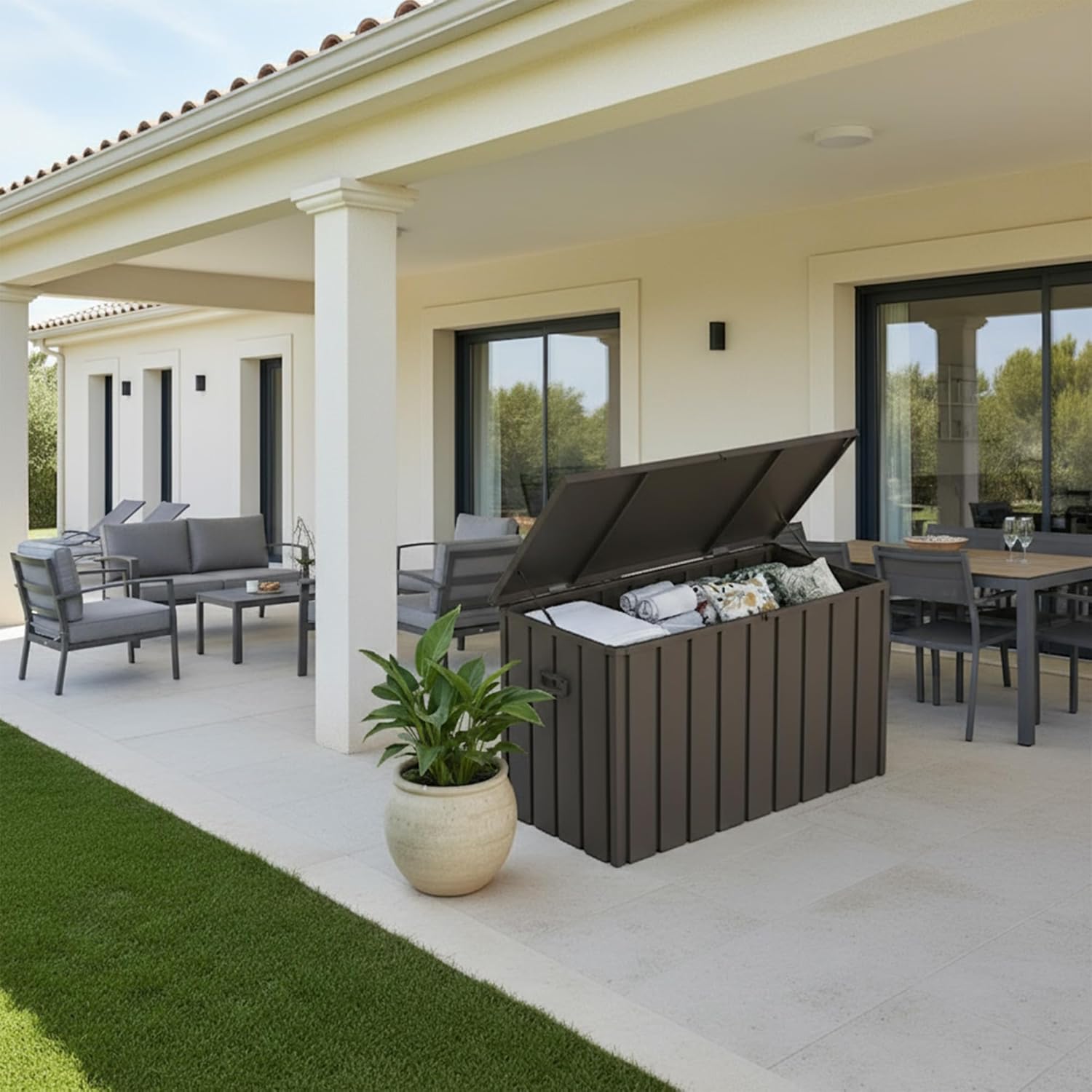 - Galvanized Steel Reinforced Lid:This sturdy storage box features a galvanized steel-reinforced lid that is fade-resistant, weatherproof, and rustproof for at least 2 years.