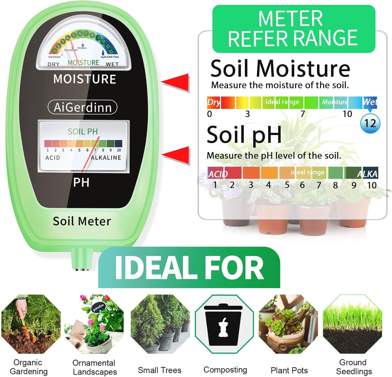 - Notes & Worry-Free Service: The 2in1 moisture meter for plants can only measure the moisture and testing pH of the SOIL, please don't test in water/any liquid. AiGerdinn provides a 365-day warranty and 24-hour friendly customer service. Please feel free to contact us if you have any issues with the 2-in-1 soil meter. We will do our best to correct the wrong, give you the best solutions, which can save your time waiting for processing progress.