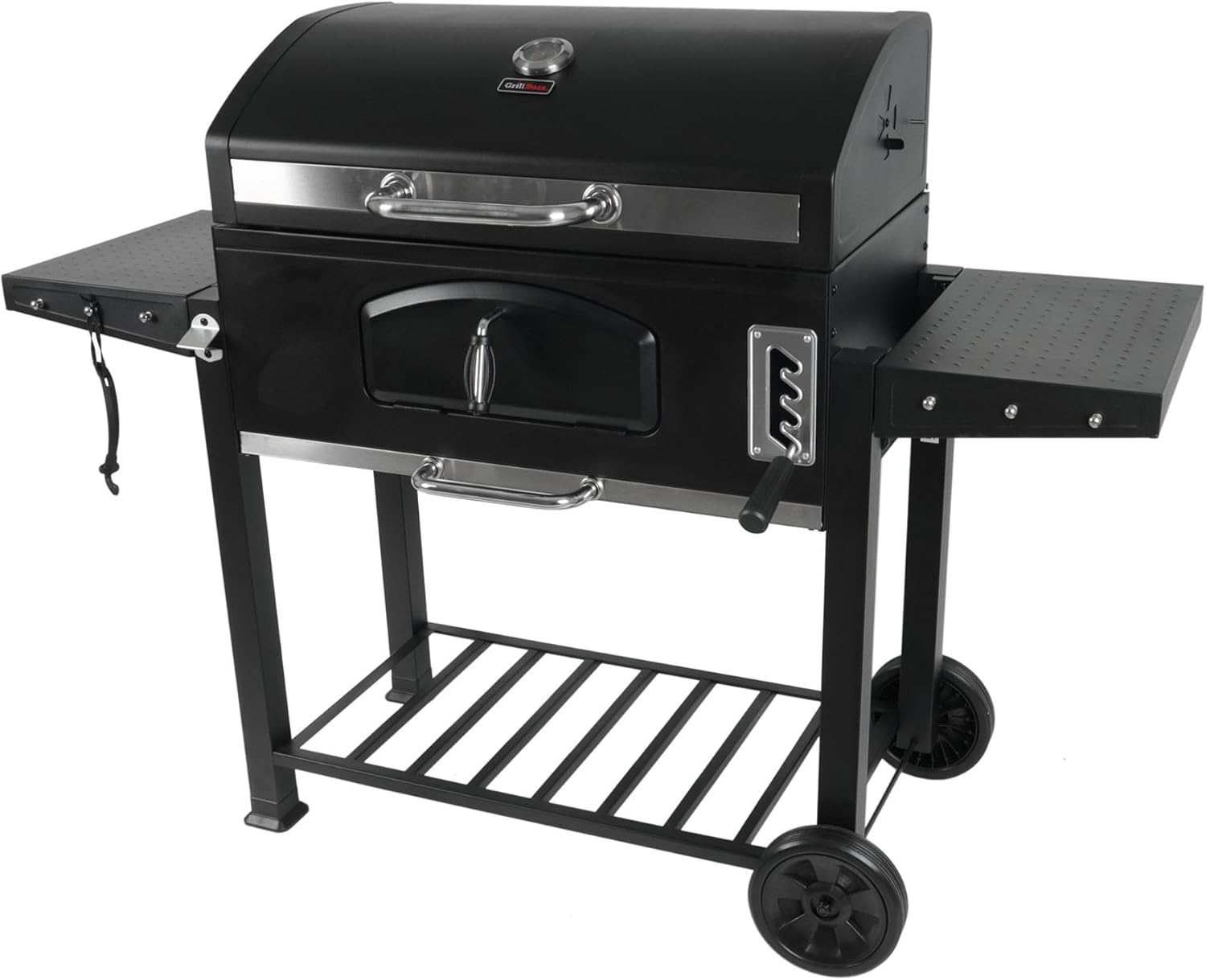 - Convenient Features: Equipped with front access door for quick and easy charcoal refills, side shelves, steel lid handle, transport wheels, and more for all your grilling needs