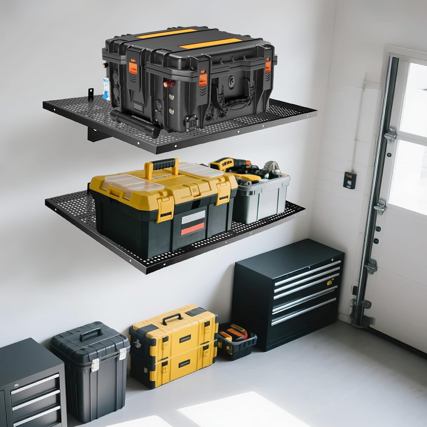 - 【ENVIRONMENTALLY FRIENDLY】 90% of our materials used are recyclable.This garage wall shelving is crafted from a single steel sheet, precision-stamped and folded for strength. Unique high-density hole design enhances functionality while delivering a sleek, modern aesthetic