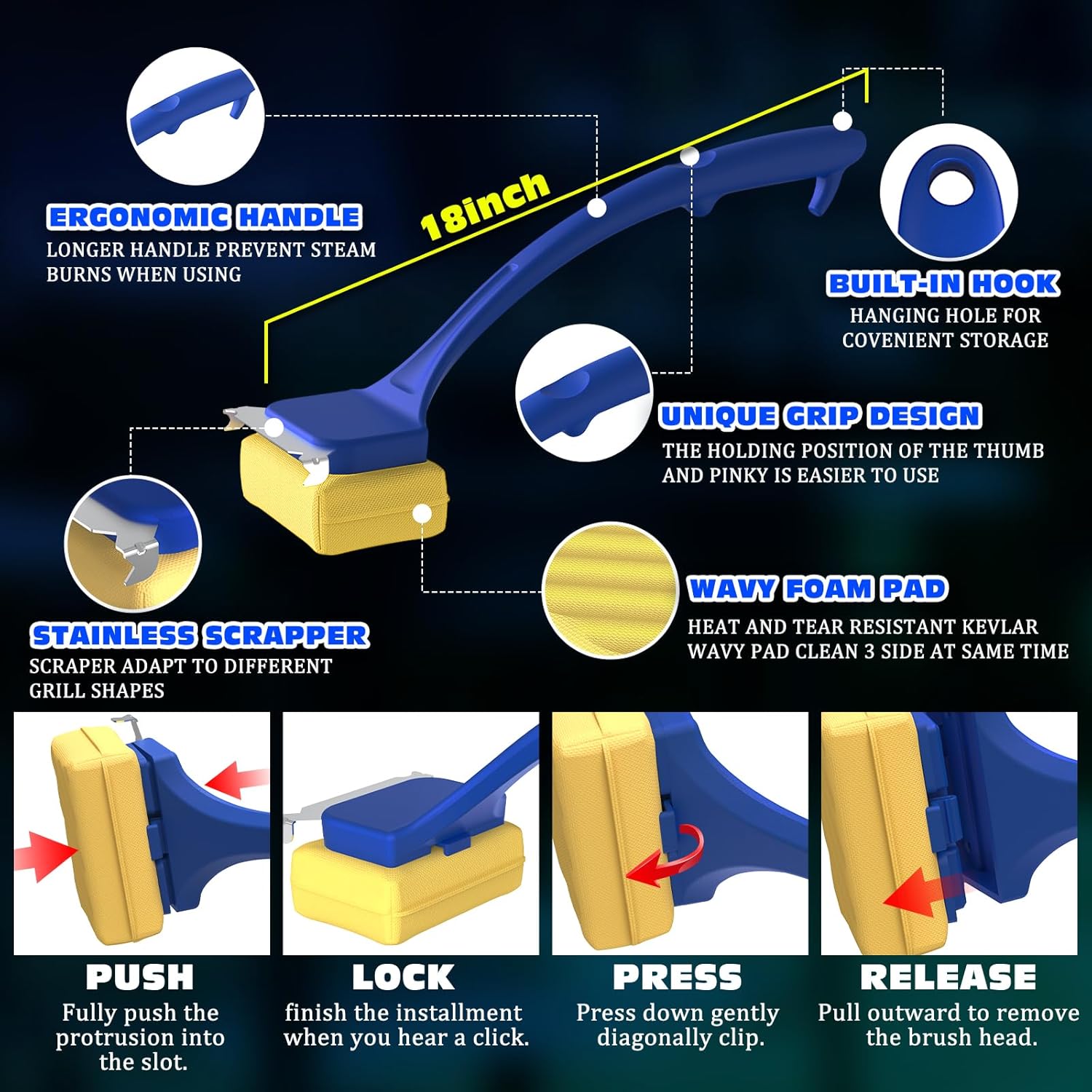 - The extended brush handle used in hand enhances reach and convenience, which is capable of cleaning safely and effectively hard-to-reach areas. while its reinforced design protects users from steam burns and used for offering a more secure grip and optimal labor-saving leverage, making it particularly suitable for every one used with variety grill accessories such as porcelain,weber gas,charcoal ,smoker,ceramic,cast iron or stainless steel grills.