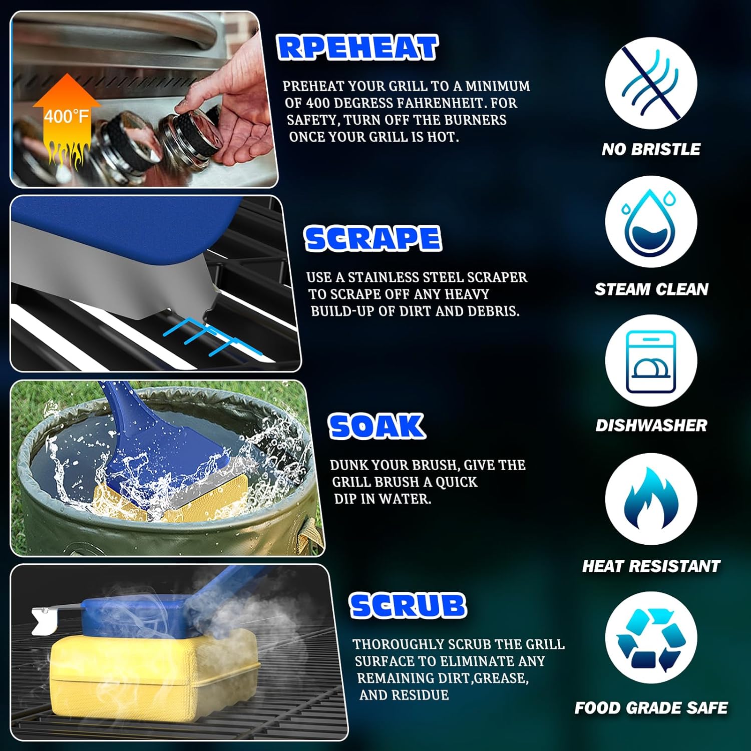 - For optimal performance used for people who have never used a steam cleaning brush before, heat the grill to 400°F, scrape off excess grease and then the stainless steel scraper is used in in water, and press firmly to ensure full water absorption. Then proceed with steam cleaning for quick and effective deep cleaning within minutes.This usage pattern can effectively solve the problem used by whom worried about brush bristles remaining on food or not cleaning thoroughly enough due to the use of traditional cleaning tools.