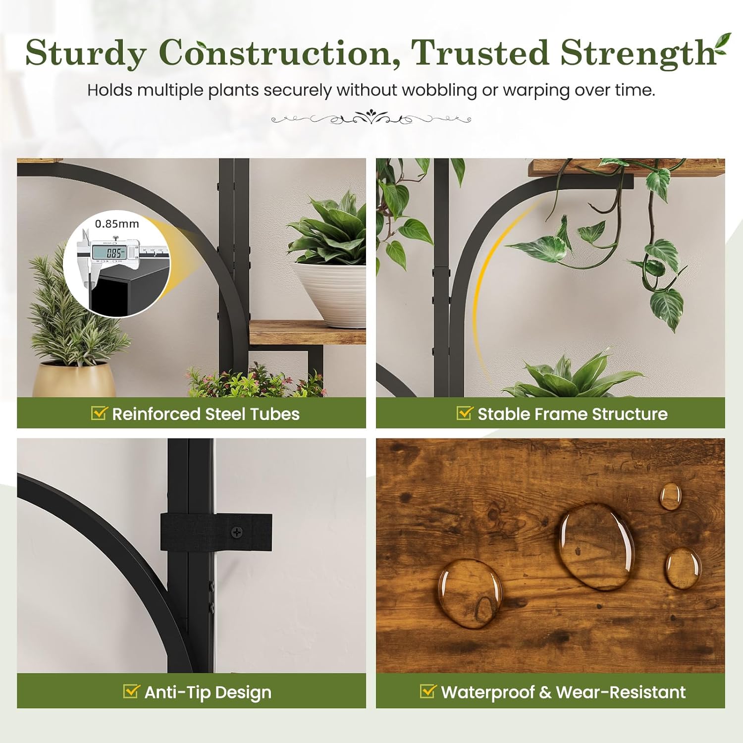 - Space-Saving 8-Tier Design - This 62" tall plant shelf makes the most of vertical space, with 8 sturdy tiers and a handy hanging hook for trailing plants or baskets. The flowing S-shaped design adds a creative, modern touch that fits beautifully in living rooms, bedrooms, or cozy corners