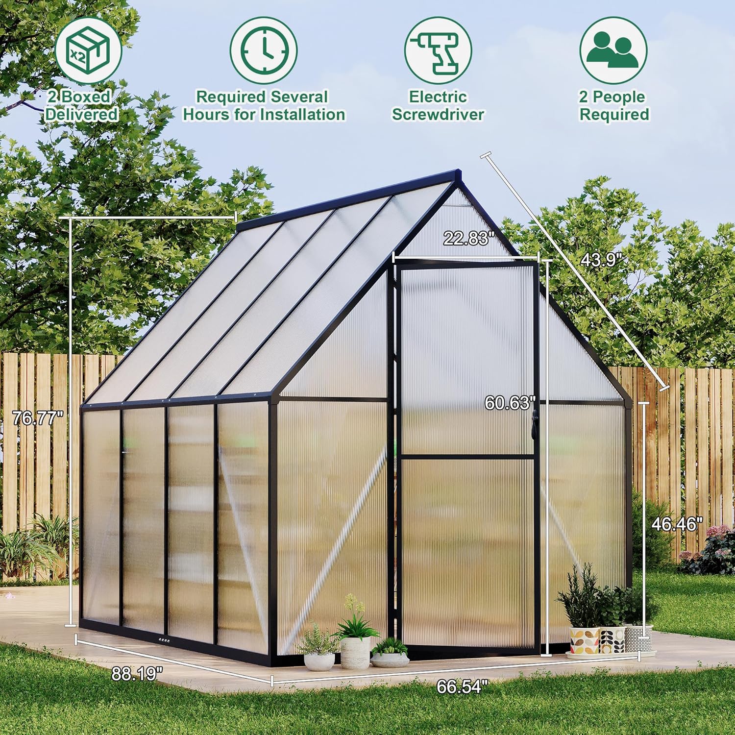 - Versatile Gardening Space - Our greenhouse not only serves as a perfect setting for plant cultivation but also can transform into a private lounge or a small guest reception room. Overall size: 88.19" W x 66.54" D x 76.77" H. Door size: 22.83" W x 60.63" H. Note that this product will be shipped in two boxes, and they might not arrive at the same time