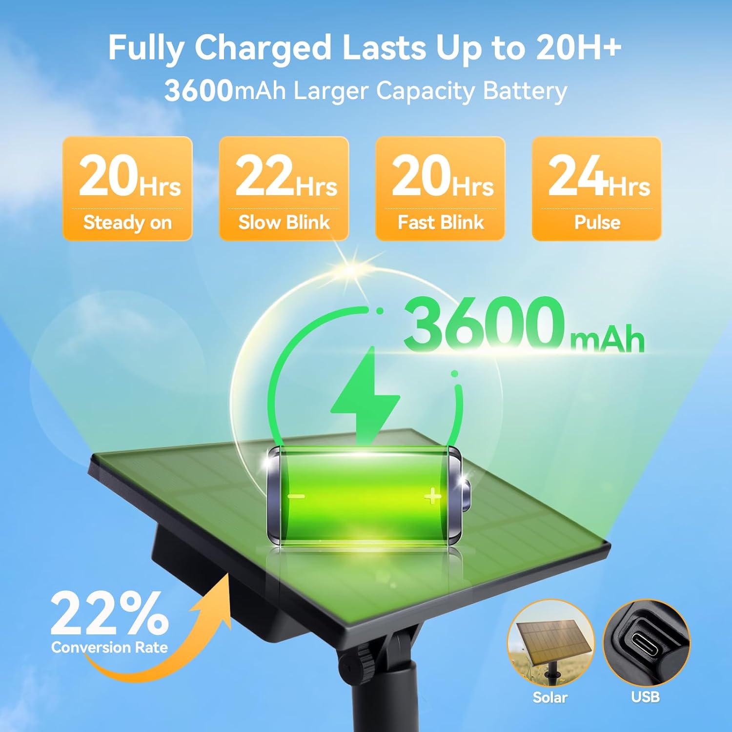 - 【Solar Charging & USB Charging】These solar patio lights feature a robust 3600mAh battery, delivering adjustable illumination lasting 10 to 20 hours on a full charge (varies by selected mode). With dual charging flexibility, solar or USB charging, you’ll enjoy seamless operation even during extended cloudy days. For optimal performance, charge via sunlight by placing the panel in direct sunlight for 8 hours, or fast-track charging with the USB port to reach full power in just 4 hours. Effortlessly sustain all-night ambiance, rain or shine.