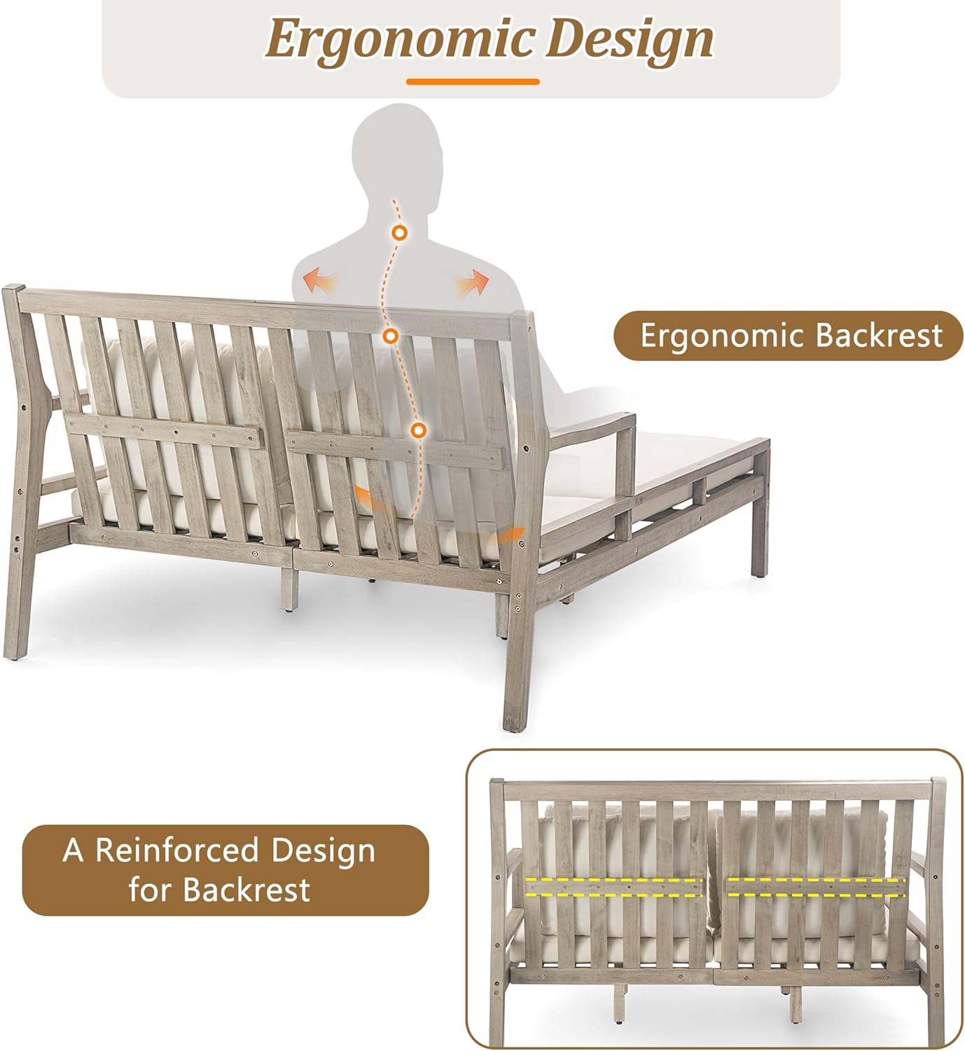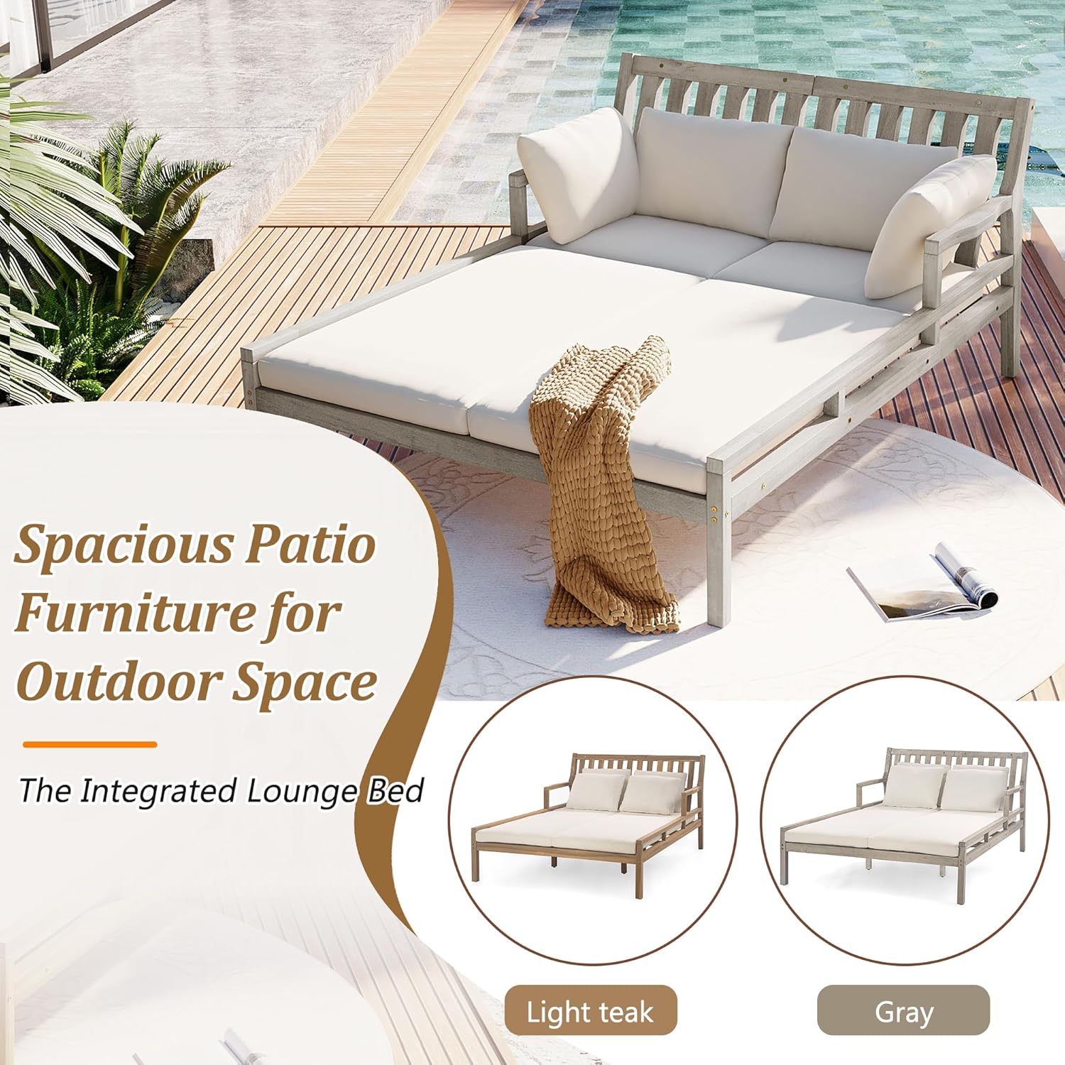 Merax Outdoor Daybed, 3 Seater Acacia Wood Daybed, Patio Day Bed with Four Pillows, Wooden Outdoor Bed with Curved Armrests for Poolside, Backyard, Garden, Gray