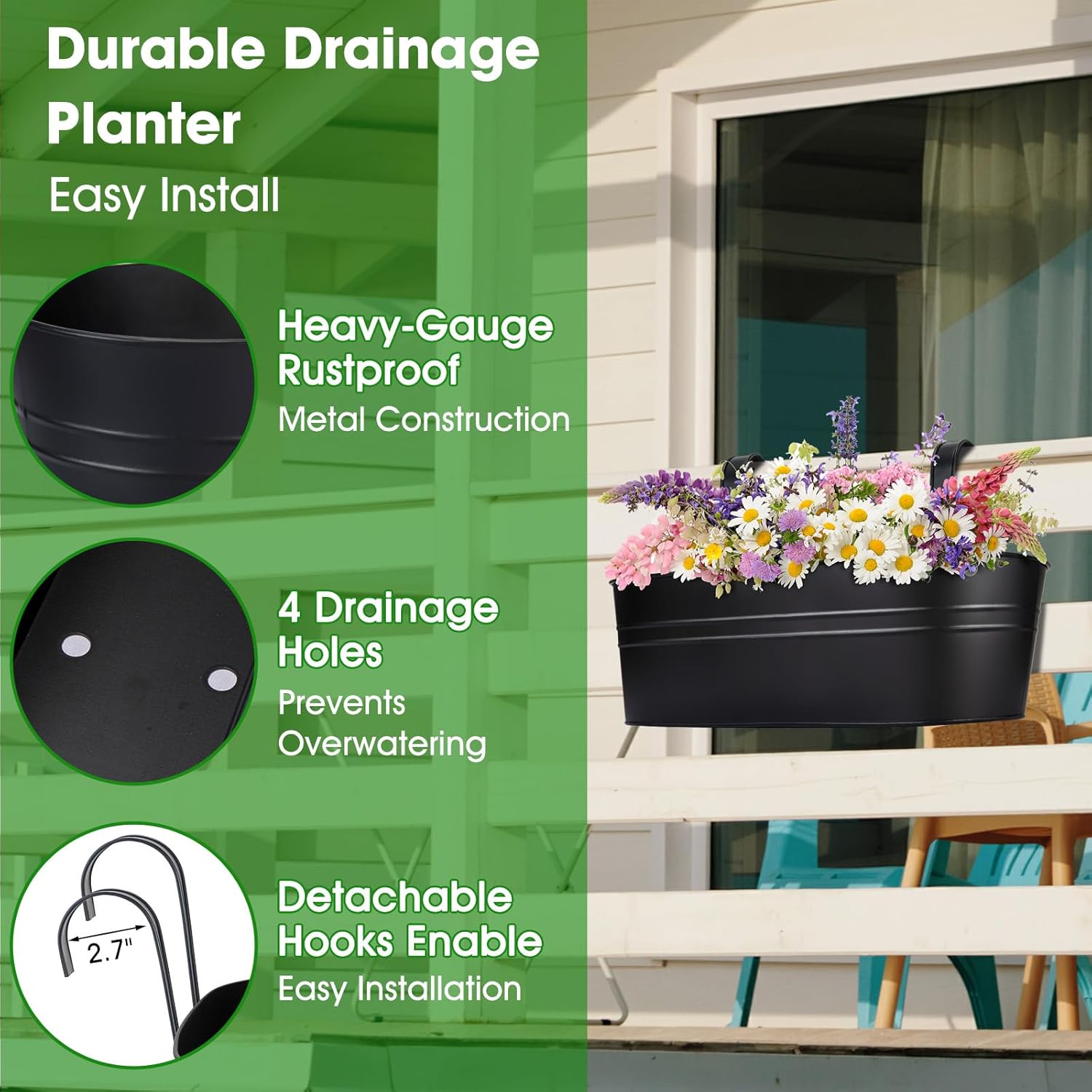 - Drainage System Promotes Healthy Plants: The main body of this balcony planters railing hanging includes strategically placed drainage holes at the bottom. This clever system allows plant roots to access moisture as needed while ensuring excellent aeration and keeps plants perfectly hydrated. Each hanging planters comes with all the necessary components for easy installation, making it a breeze to hang these planters.