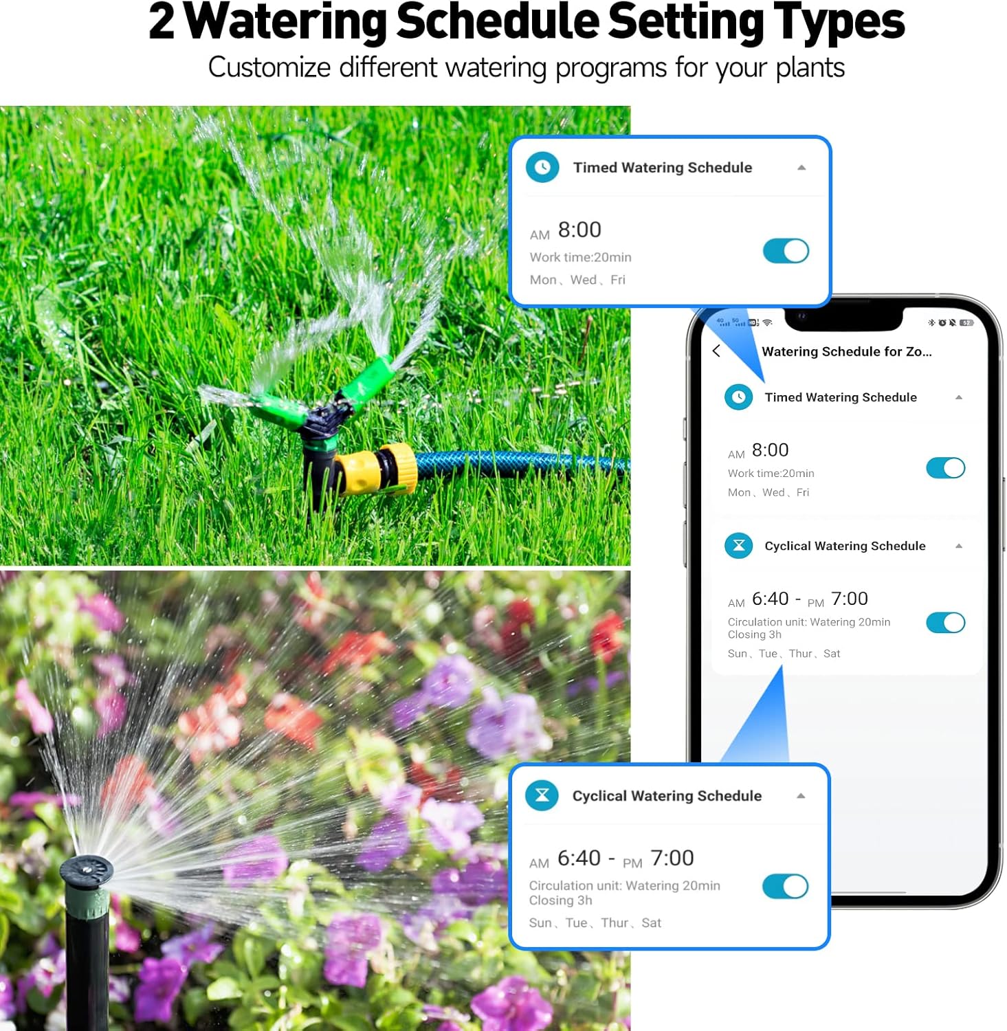 - 【2 Watering Schedule Types】: Under timed watering mode, you can set a timed watering schedule to let the hose timer run water at a specific time. Customize its start time, irrigation duration, and watering weekly cycle or on odd day/even day/ every few days to meet your different watering needs. Under the cyclical watering mode, the hose faucet water timer will cycle watering within the preset start and end times automatically. When the irrigation duration, interval time, start and end times are set, the smart irrigation timer is ready to take over the control of the lawn and garden.