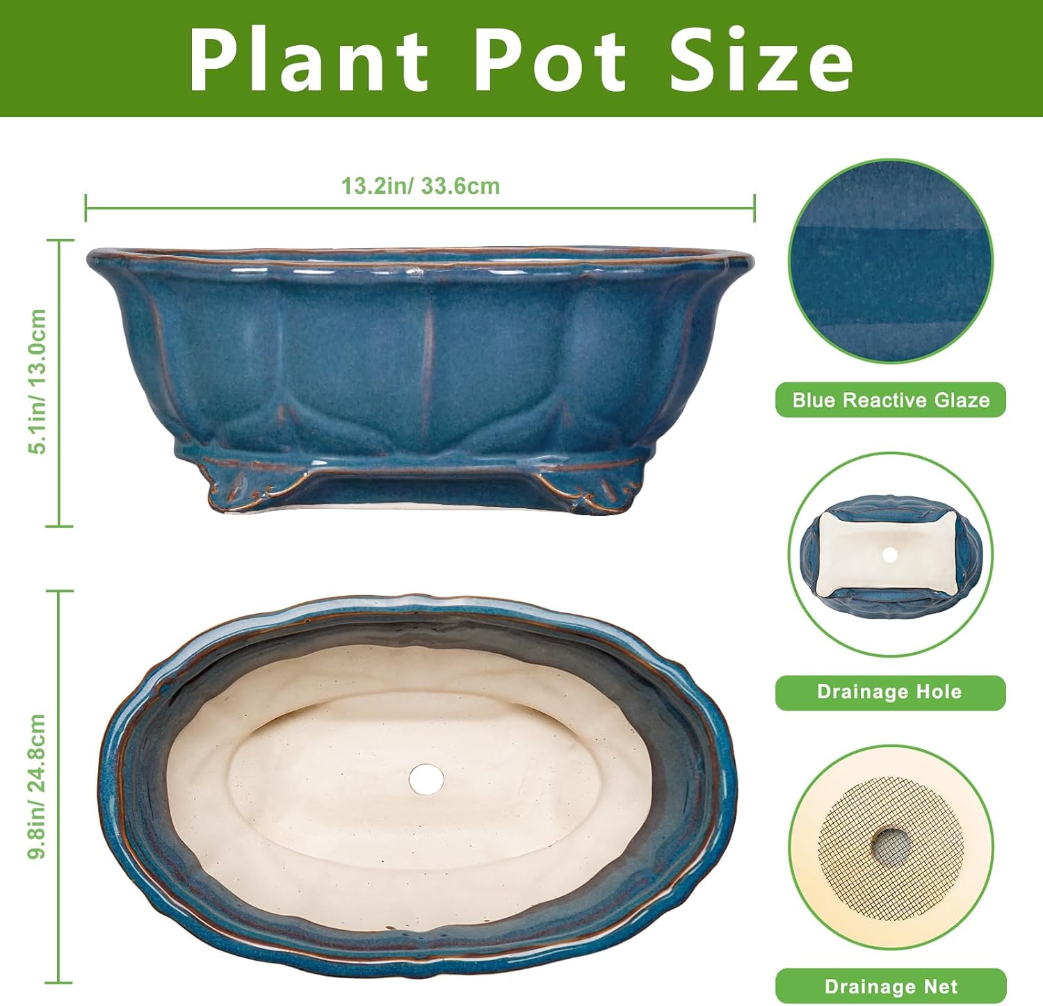 Bonsai Pots - 13.2 Inch Oval Ceramic Pots for Plants, Large Succulent Planter with Drainage Hole, Decorative Planters for Indoor Outdoor, Garden House Decor, Housewarming Gifts, Retro Blue