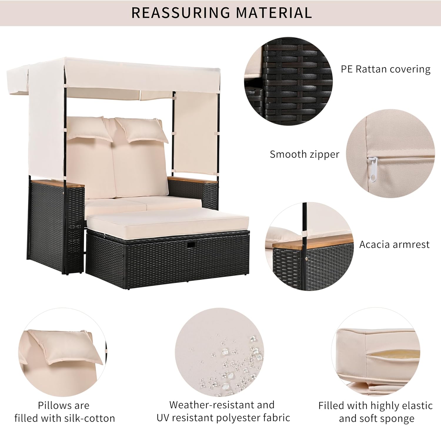 Merax 2-Piece Outdoor Rattan Daybed, Wooden Handrail Table Patio Loveseat Sofa Bed with Bench Lounge Roof Set and Cushions for Poolside, Backyard and Garden, Beige