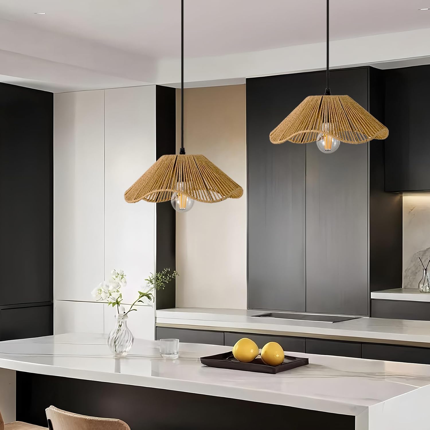 TERLEENART Hard Wired Rattan Pendant Lights Set of 2,Kitchen Island Pendant Lights with 12” Flower Shade,Boho Handwoven Paper Rope Rattan Ceiling Light for Living Room Dining Room Restaurant Foryer