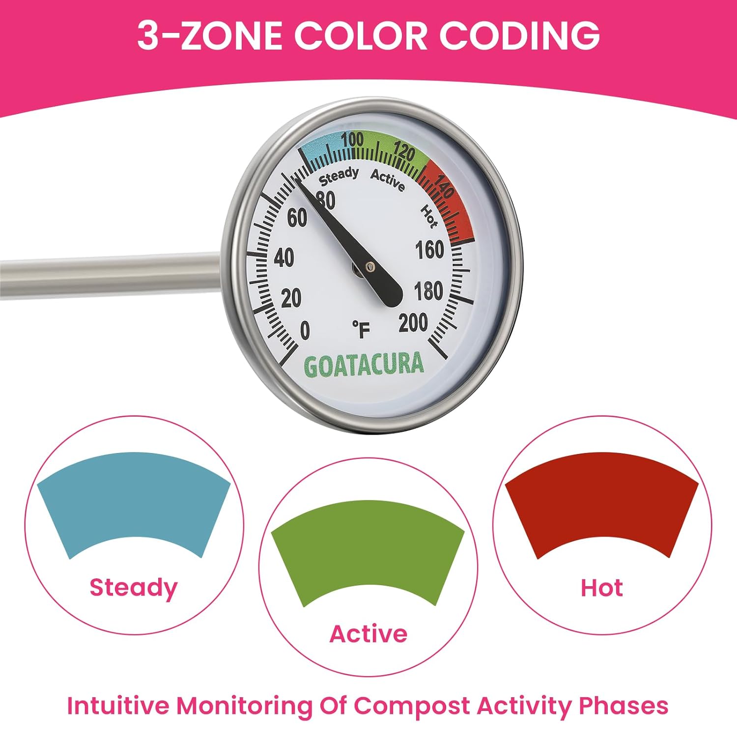 - 【Features】3-Zone Color Coding: Dial with blue (80-100°F), green (100-130°F), and orange (130-160°F) zones for real-time compost activity tracking