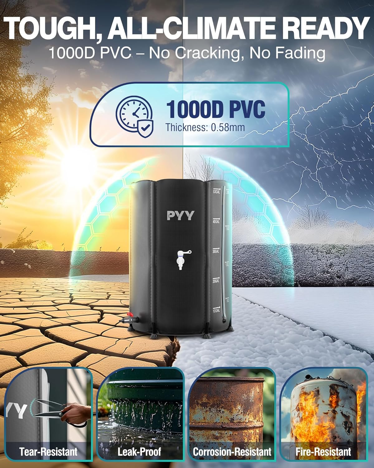 - ๐๐ฎ๐ซ๐๐๐ฅ๐ & ๐๐ญ๐ฎ๐ซ๐๐ฒ: Our rainwater collection barrel is made from high quality 0.5mm thick 1000D PVC, lead-proof, corrosion-resistant, sun-resistant, and crack-resistant. Equipped with 6 robust legs of 1.5mm thickness, the rain storage barrel holds 100 gal water steadily. Enjoy the convenience of irrigation or cleaning in various areas, while our rain water catcher withstands the test of time