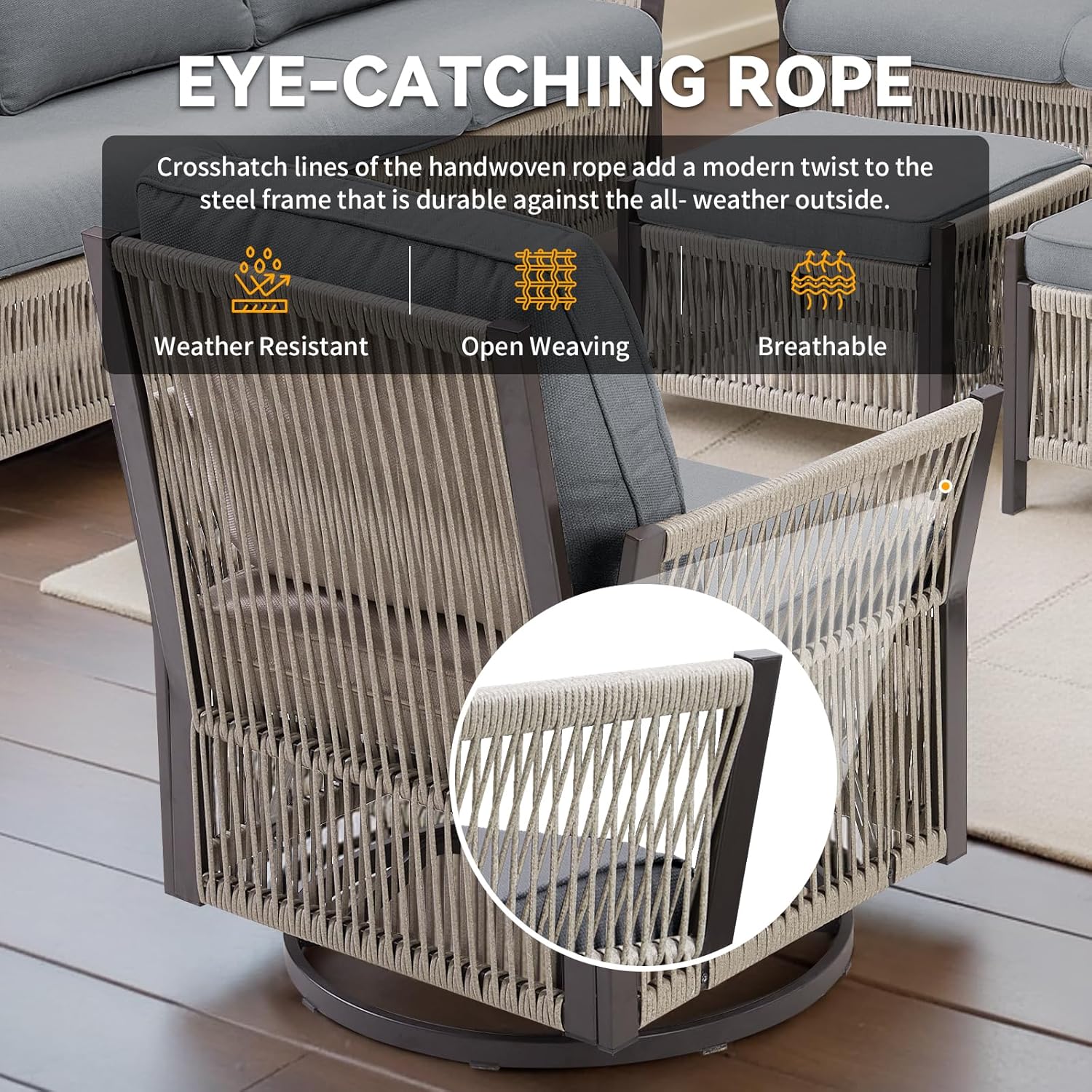 Patio Furniture Wicker Rope Outdoor Conversation Set, 9-Piece All Weather Patio Furniture Rattan Sofa Sets w/Swivel Rocking Chairs & Ottomans, Side Table for Backyard, Balcony, Deck, Gray