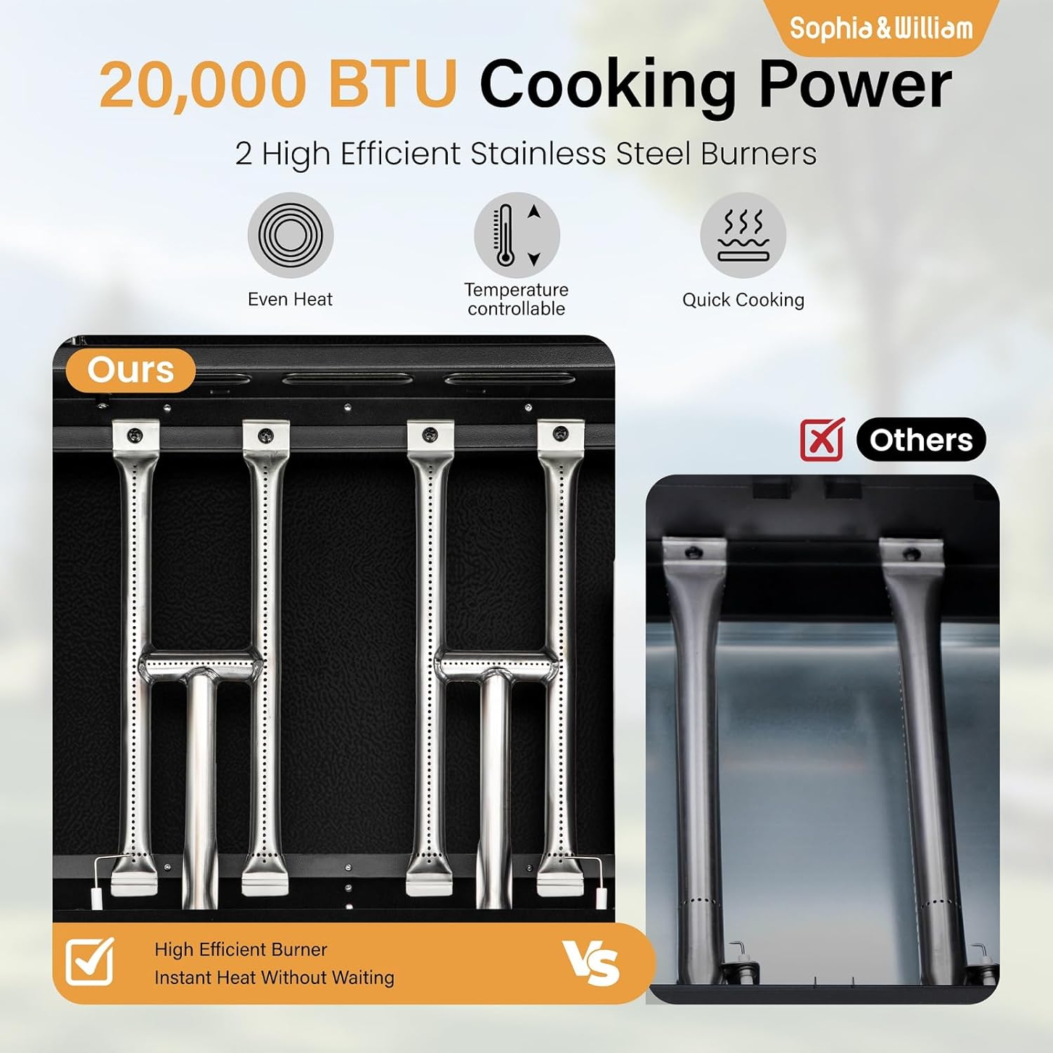 - Cast Iron Griddle Pan: Heavy-duty cast iron griddle pan and two stainless steel H-style burners delivering a total of 20,000 BTU, this camping grill propane portable ensures fast, even heat across the entire surface. The H burner design provides consistent flame distribution for better cooking control