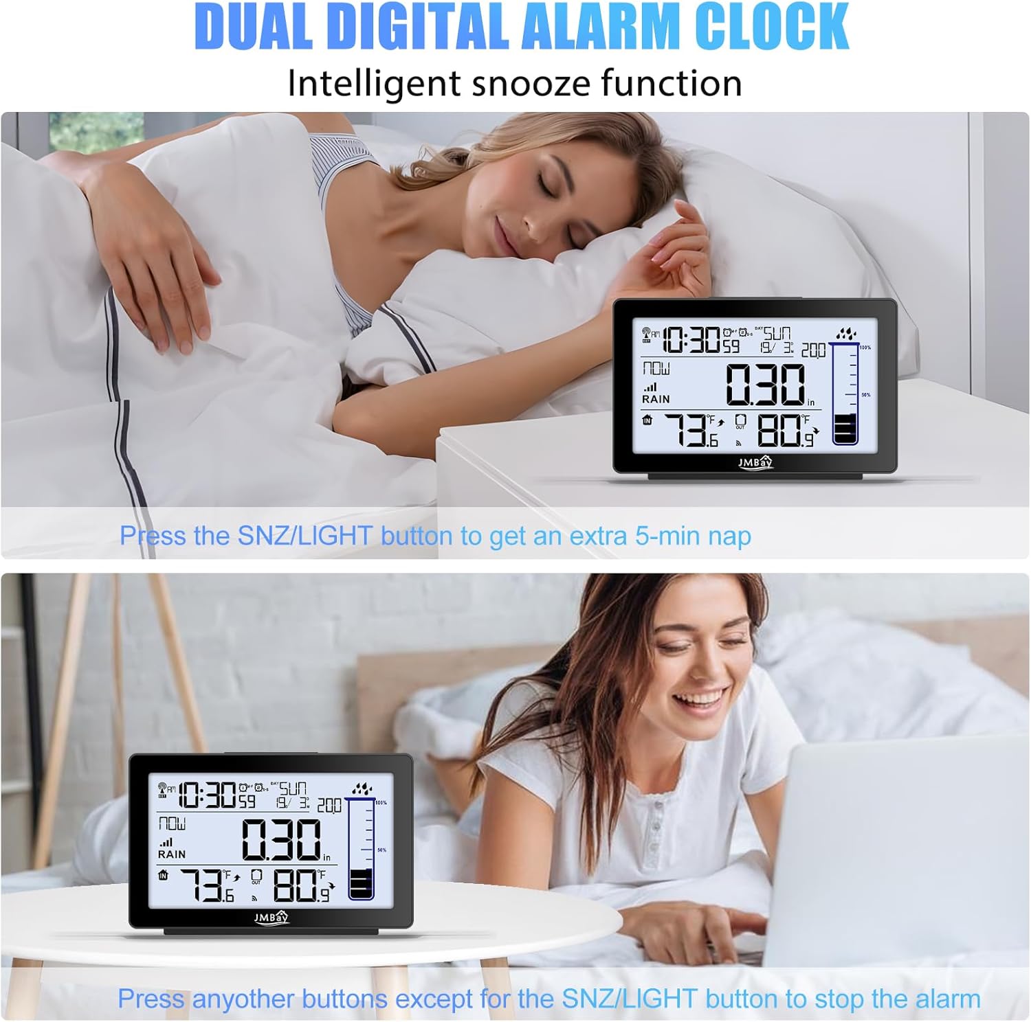 - Multi Function Rain Gauge Weather Station --- In addition to rainfall monitoring, this digital rain gauge can also provide real-time indoor and outdoor temperatures, WWVB Radio control time function. What’s more, dual alarm clock with snooze function and calendar is practical in your usual life. Functional and stylish, JMBay rain gauge weather station is the perfect decoration for your living room, bedroom, office, greenhouse, tent, and more.