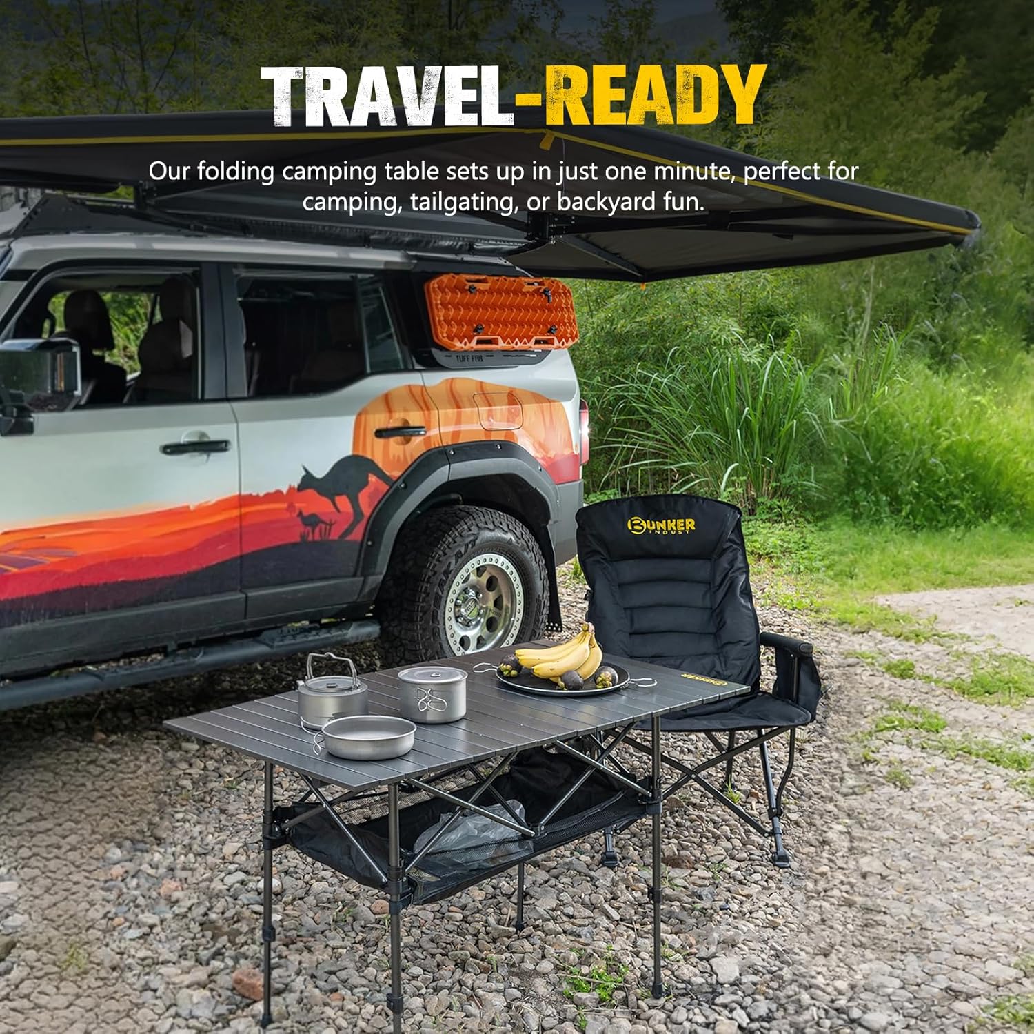 - Big on Space: With a spacious 47" x 26" aluminum tabletop, our folding camping table gives you plenty of room to prep meals, serve snacks, play cards, or spread out your gear. No more balancing items on your lap or digging through bags. Plus, the mesh layer underneath adds bonus storage for tools, snacks, or supplies, and detaches easily from the table legs when it’s time to pack up.