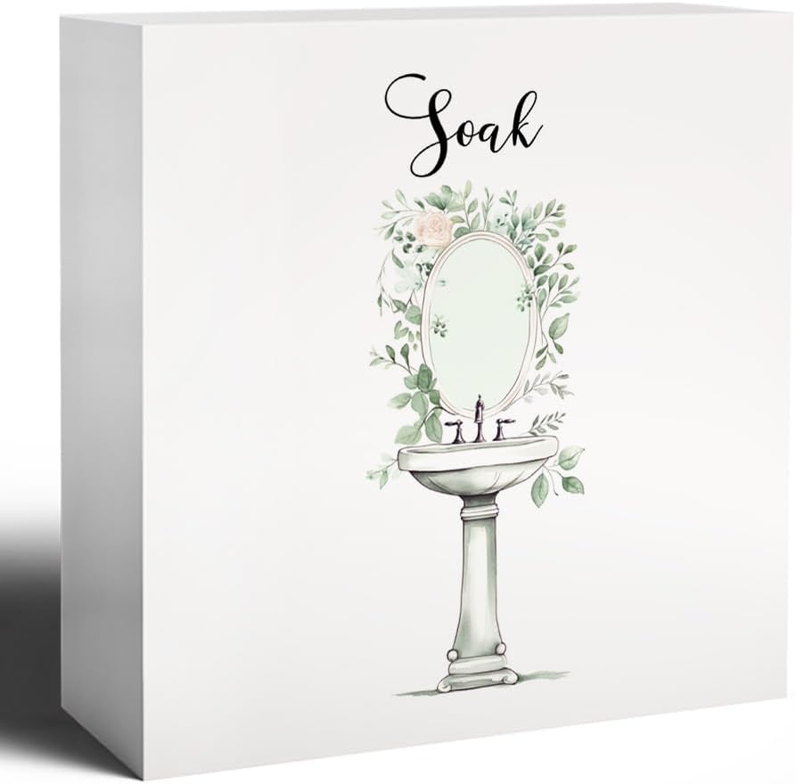 Soak Funny Bathroom Wooden Box Sign, Eucalyptus Botanical Wood Signs for Restroom Bathroom Toilet Half Bath Shelf Counter Decor, 5x5 Inch