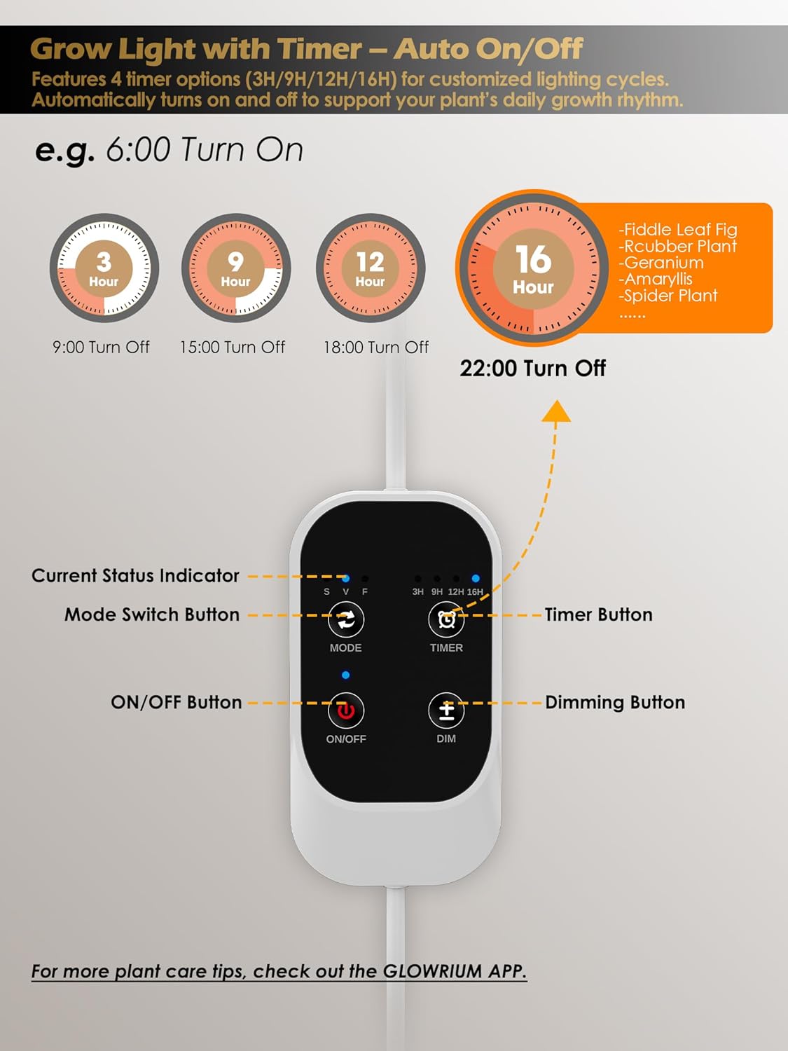 - 【Smart Timer Settings (3H/9H/12H/16H)】 Built-in timer offers 4 automatic lighting cycles. Simply set your preferred schedule, and the light will turn on and off automatically—perfect for maintaining plant care at home or while away.