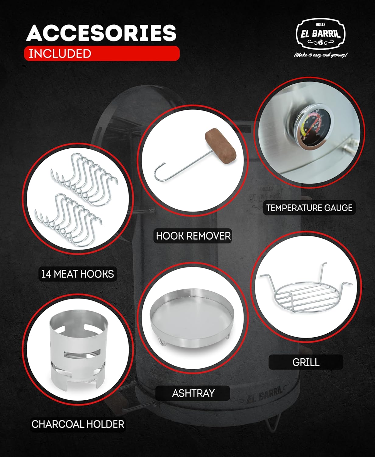 El Barril Lite Large Barrel Smoker Grill, Stainless Steel 430, 45 lb Capacity, 14 Meat Hooks, Upper Grill and Handler, Outdoor Vertical Charcoal BBQ (Lite 45LBS Large)