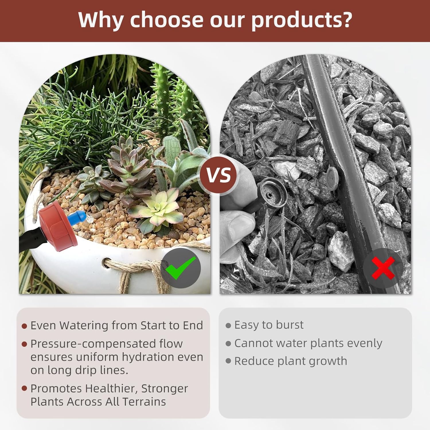 - Built to Last: Our 0.5 GPH Pressure Compensating Spot Watering Drippers/Emitters are made from premium UV-resistant plastic to withstand heat, sun, and outdoor weather. Designed for year-round performance, it won't crack, age or leak - ensuring reliable drip irrigation every season.