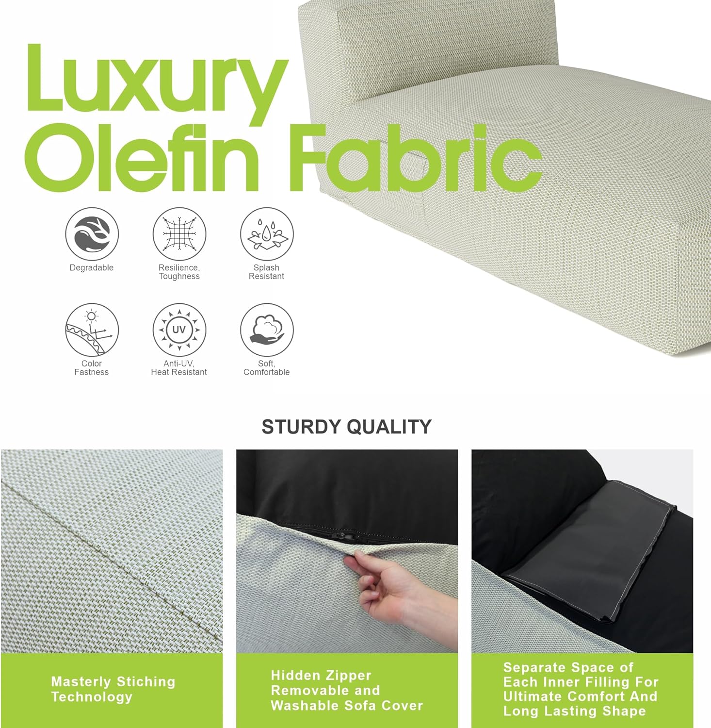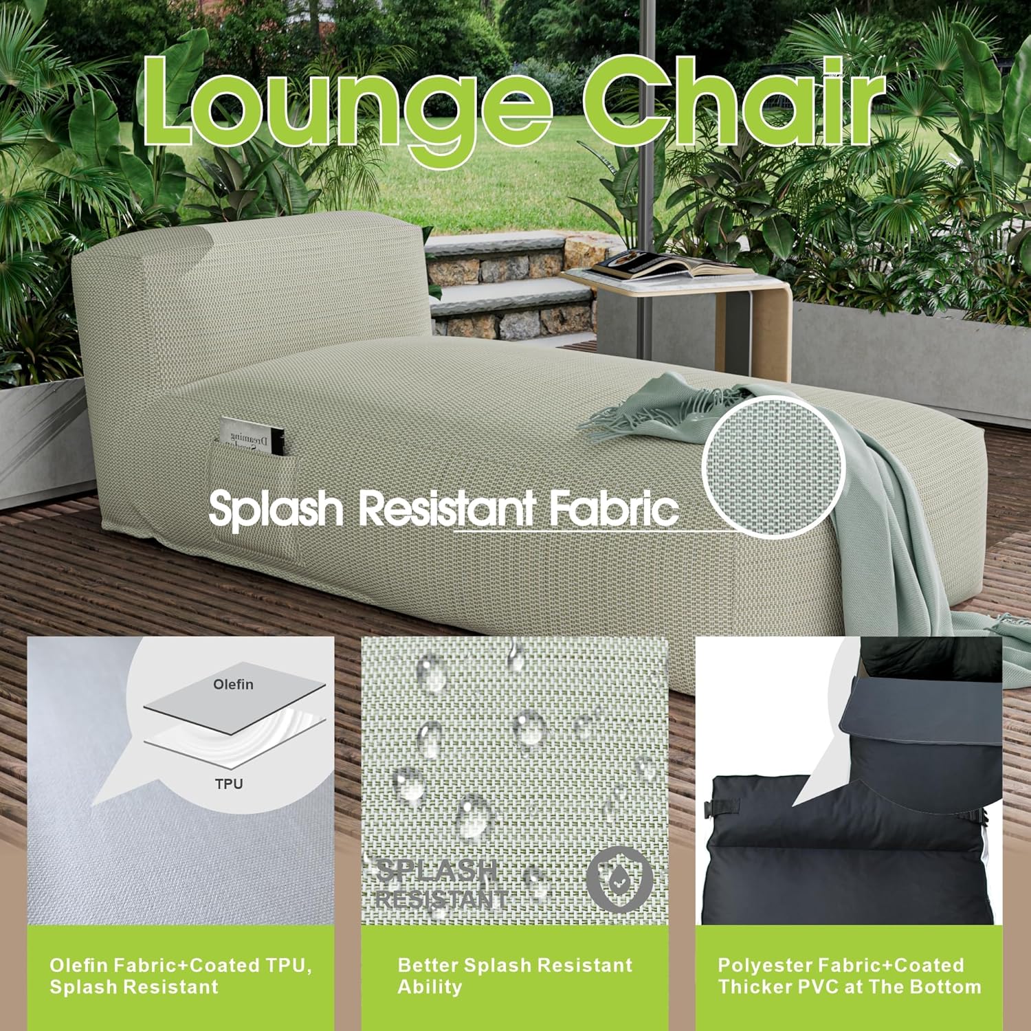 - Premium Olefin Fabric – Water Repellent, UV Resistant, and Durable - Made with high-performance olefin fabric, this lounger resists splashes, fading, and UV rays while remaining breathable and soft. Olefin is known for its color fastness, heat resistance, and eco-friendliness, making it the ideal material for outdoor lounge furniture that looks good and holds up season after season.