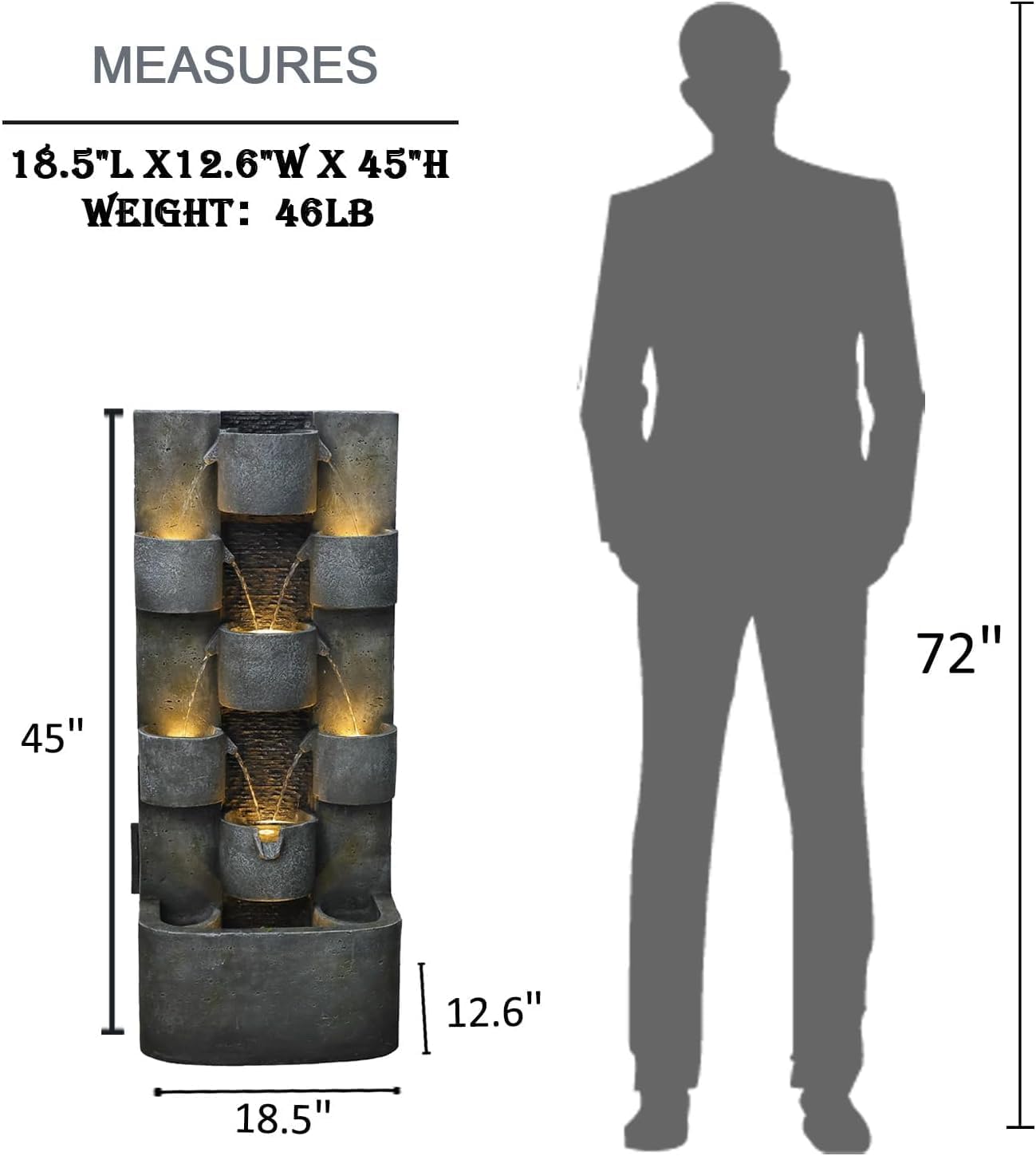 45" H Outdoor Water Fountain Garden - Large Cascading Waterfall Freestanding Fountains Water Feature with Lights for Patio Backyard Deck Porch and Home Decor, Concrete Artistry Style, Gray