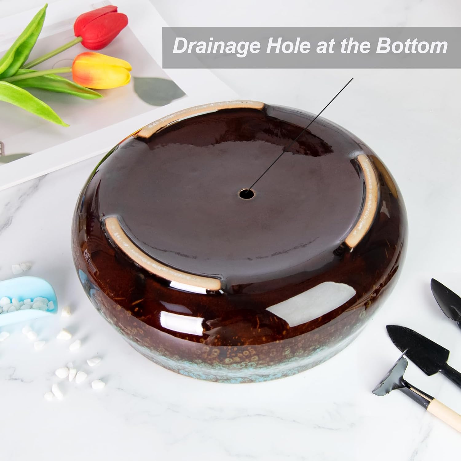 ARTKETTY Succulent Pots - 8 Inch Plant Pot, Large Bonsai Pots with Drainage, Ceramic Planters for Indoor Outdoor Plants, Round Shallow Cactus Flower Plant Container Bowl Decorative Home Garden