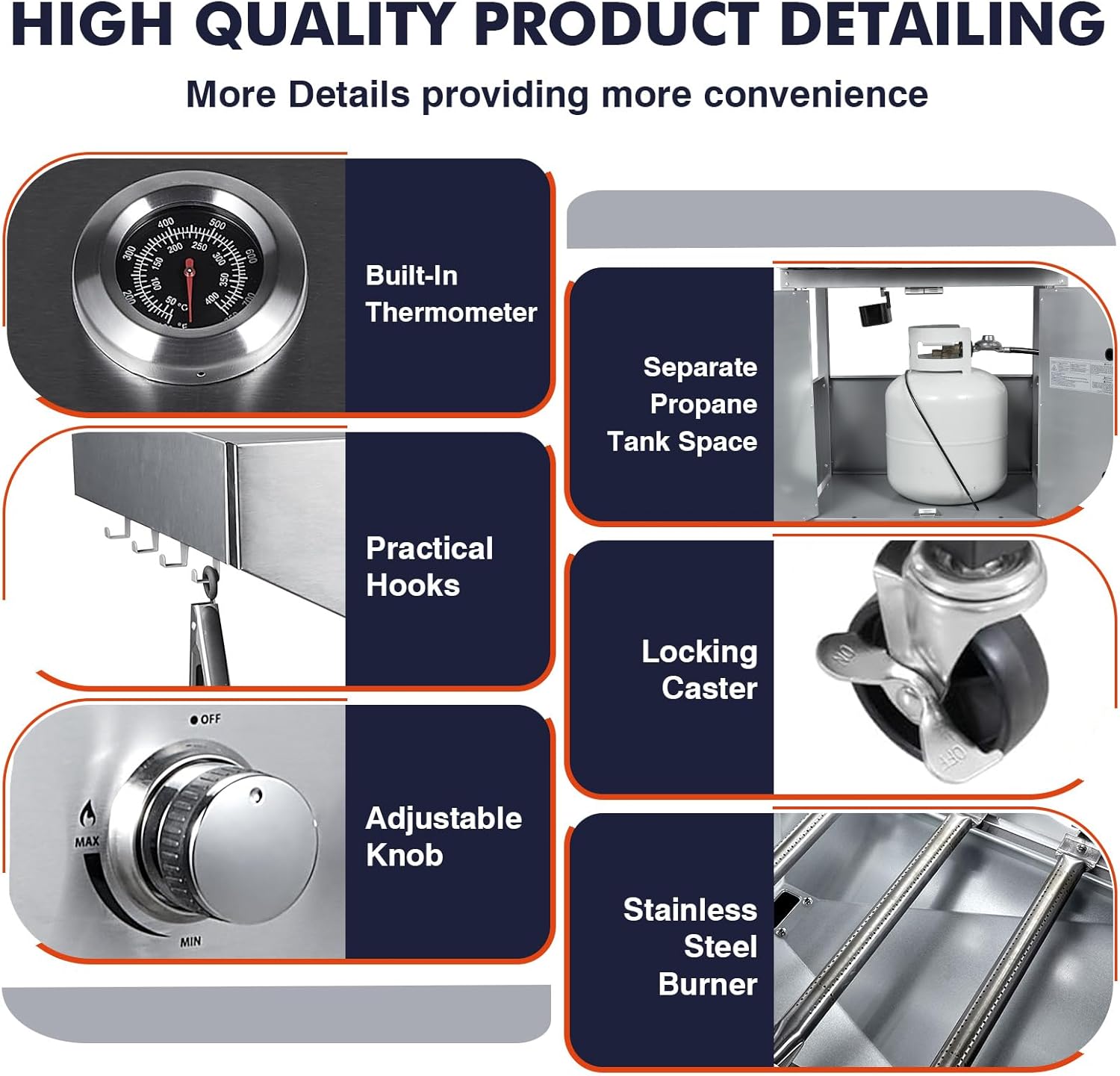 - 🥥[Liquid Propane Power] This efficient gas grill heats up quickly with a 20-pound propane tank and includes storage cabinets, a stainless steel finish and a built-in thermometer. Allowing you to enjoy delicious grilled meals right away.