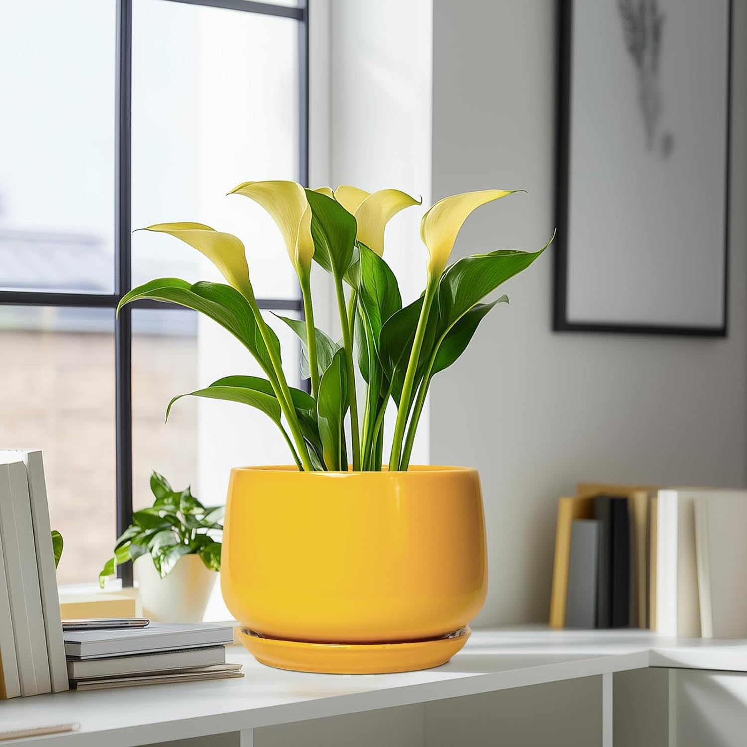 - Dimensions: These ceramic flower pots measures 9.06" x 9.06" x 6.42". This yellow planter is an ideal choice for growing olive tree, snake plant, money tree, monstera deliciosa, ZZ plants, geranium plant, pothos, peace lily, succulents, cacti, aloe vera, orchids, african violet, bonsai tree and other indoor & outdoor plants