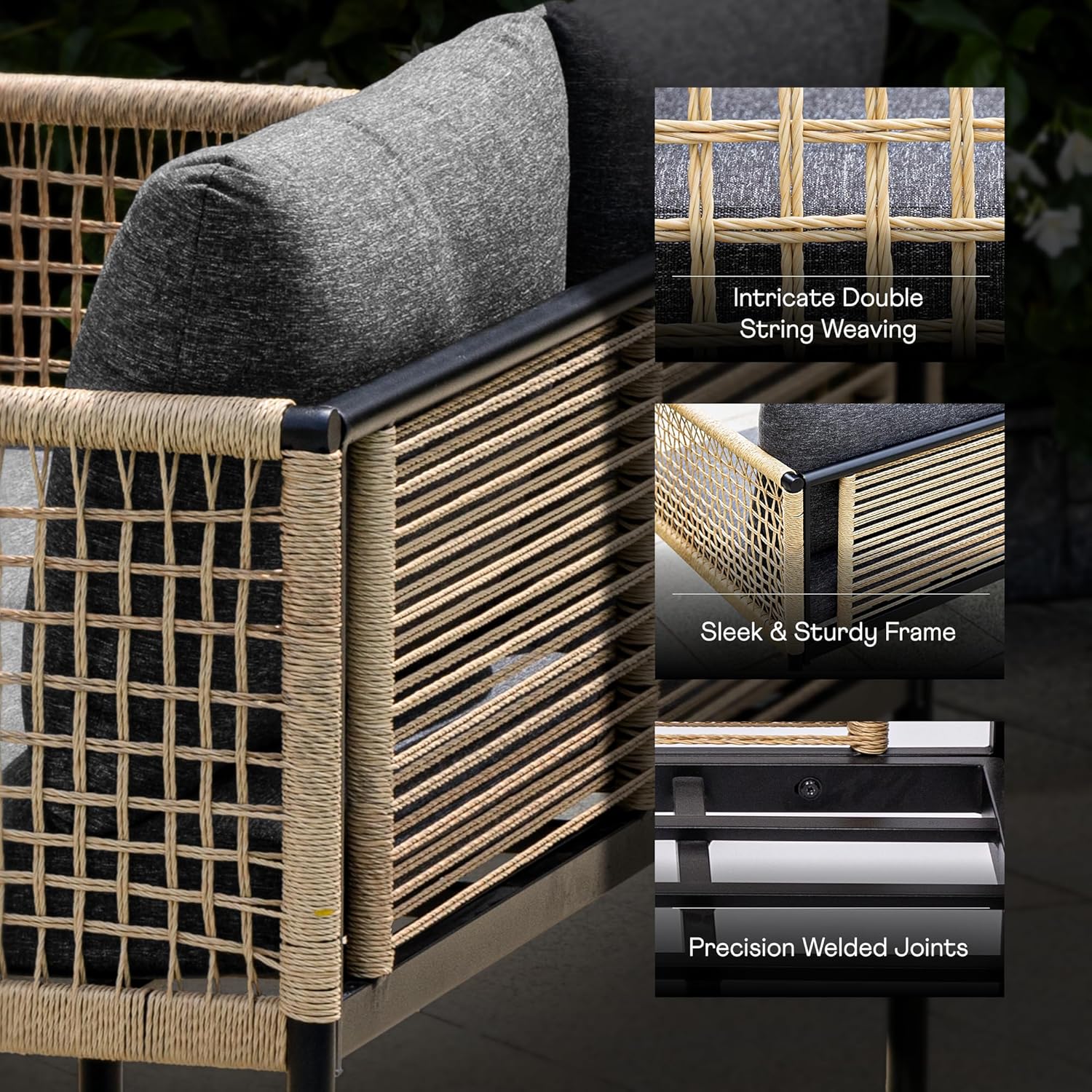 - OUTDOOR SOFA SET WITH COFFEE TABLE: Complete your patio with this sleek outdoor sofa set—a loveseat with ottoman feel, minus the bulk, ideal for small gatherings or relaxing solo