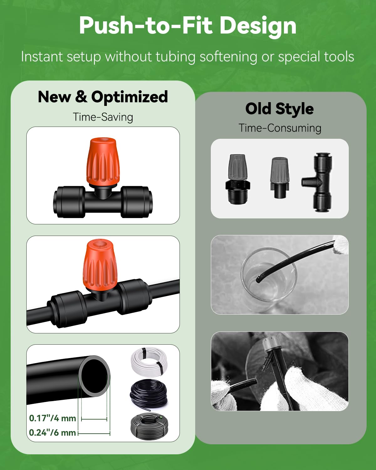 - Push-to-Fit Design: No tubing softening or extra tools needed! Simply push the tubing into the inlets of the drip irrigation spray emitter, and start watering the plants. To detach it, press the inlets and pull out the tubing. (NOTE: Tubing Not Included!)